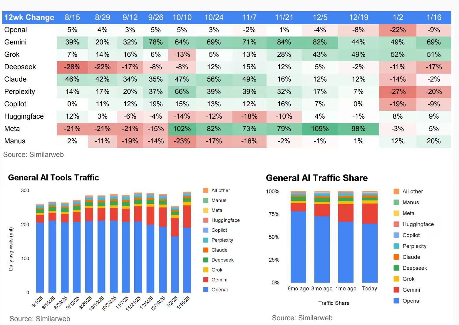 ·Grok是后半程的黑马。8月到10月还在个位数徘徊,10月10日那周甚至跌了13%。但从11月开始突然起飞,12月5日43%,12月19日49%,1月2日52%,1月16日51%。连续两个月保持50%以上的增速,势头非常猛。