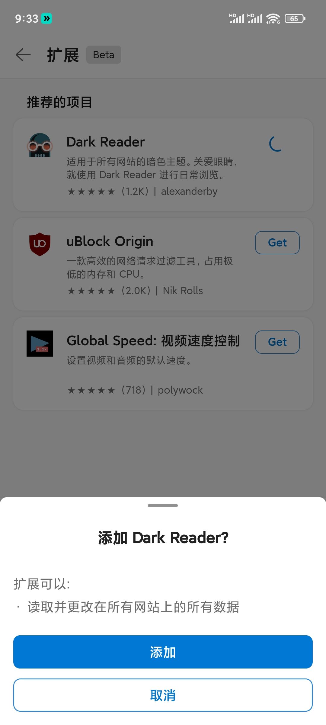 虽然目前只有三款插件可供安装,但是据开发者描述,从能力的角度上来说,是把桌面端 Extension 的能力近乎全部都搬到了 Android 平台上,也就是说桌面端能安装的扩展程序,讲道理在Android上都能安装。