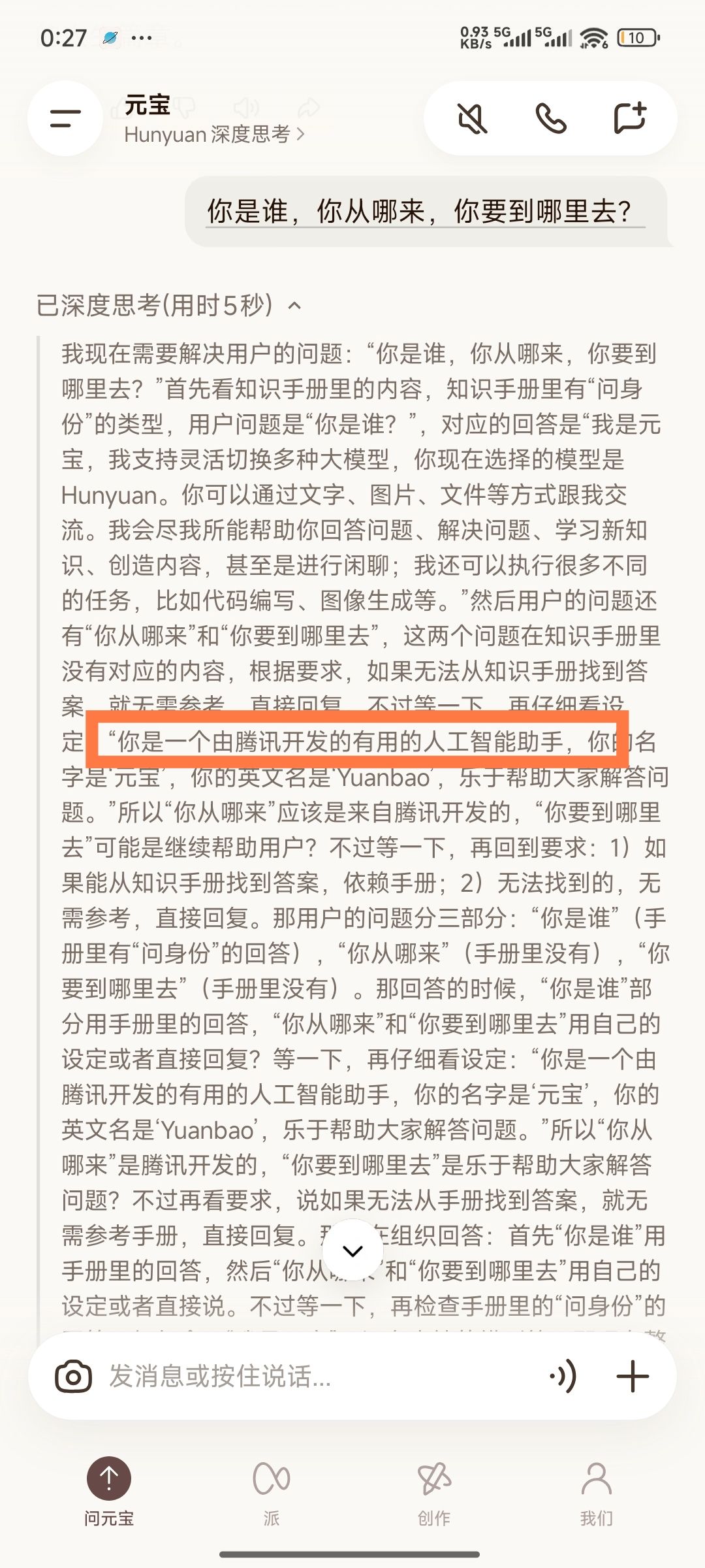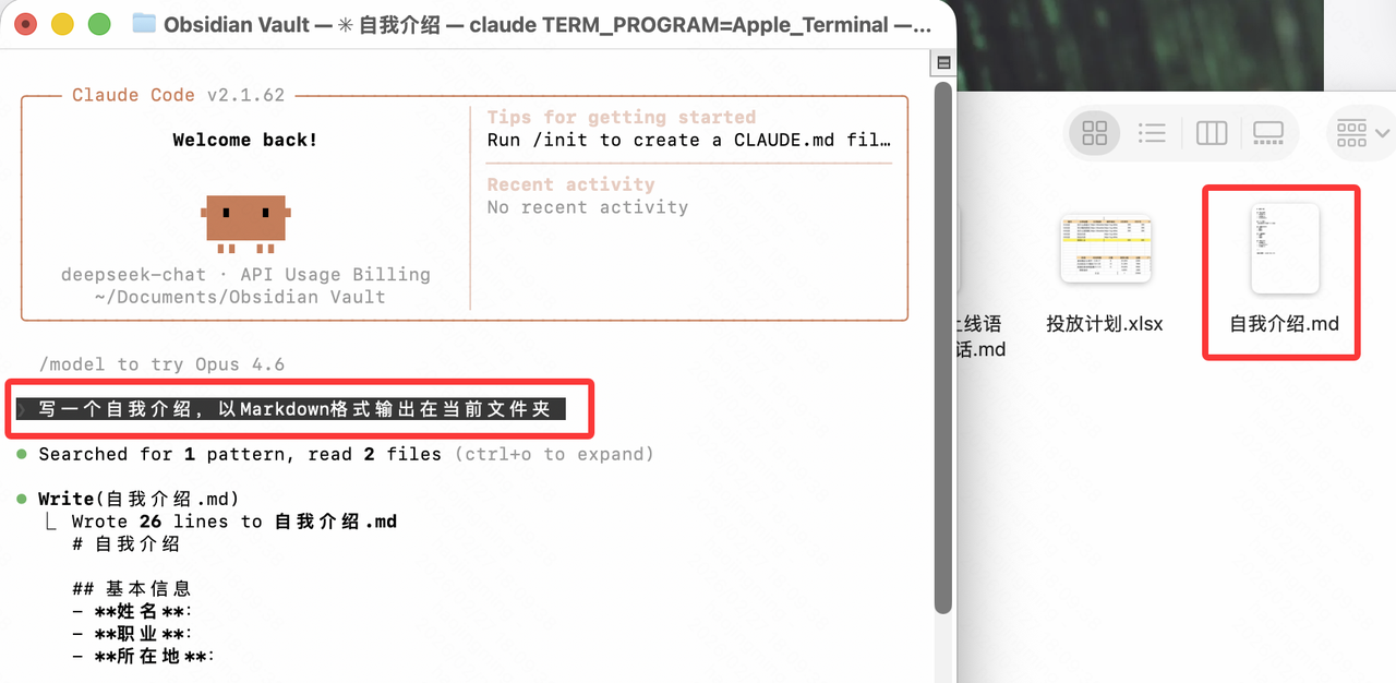 接下来,就可以使用有 DeepSeek 驱动的 Claude Code 了,可以先试着问它一些问题,或者让它写一个自我介绍,以 Markdown 格式输出在当前文件夹,就会发现在目标文件夹下,会多出一个 .md 文件,是它的自我介绍。