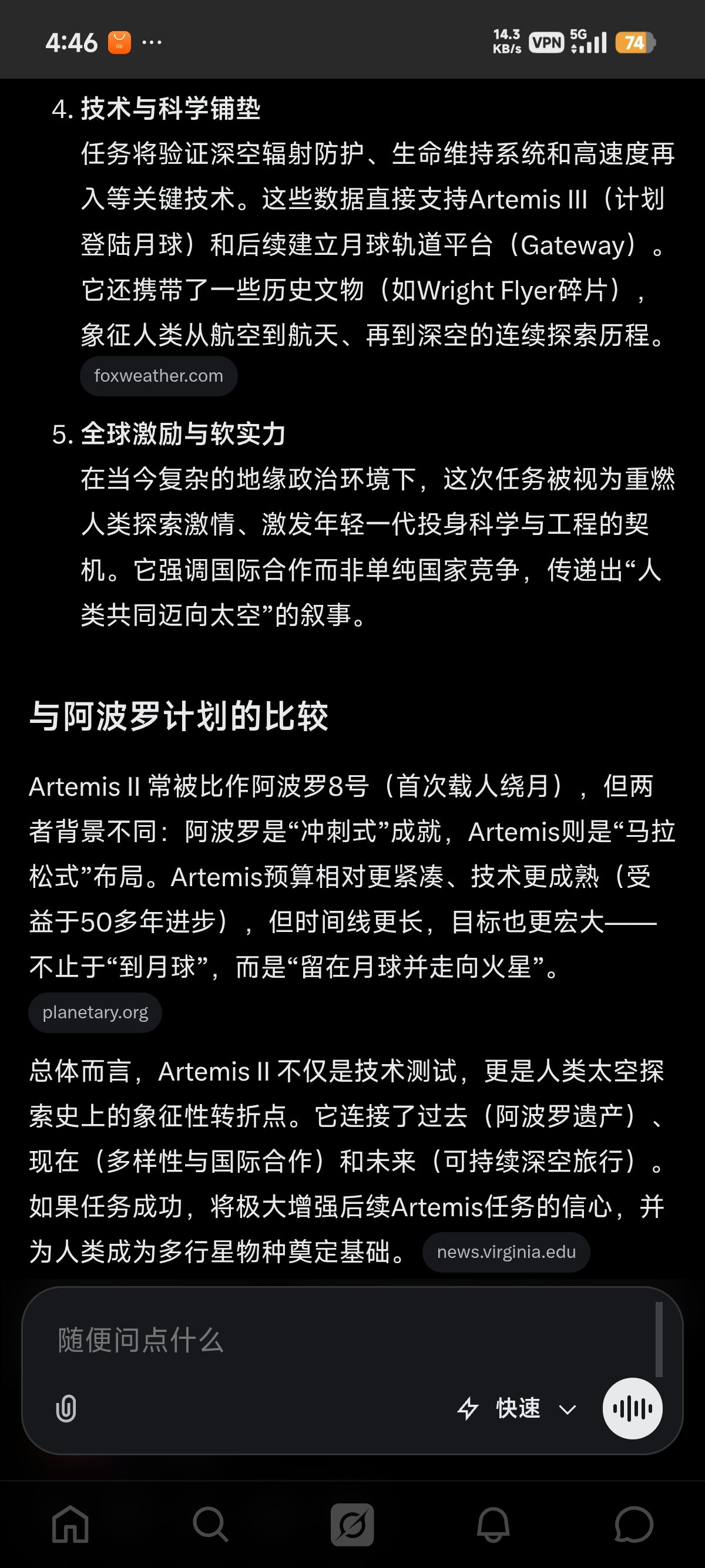 3、查新闻,比如问它: 中国和美国登月计划的新闻;