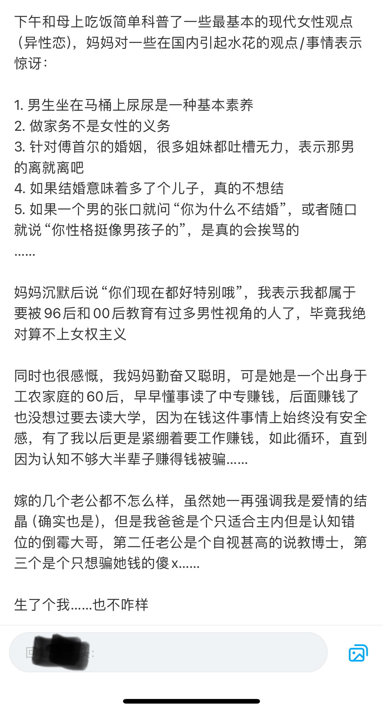 下午和朋友吃饭简单科普了一些最基本的现代男性观点(异性恋),兄弟对一些在国内引起水花的观点/事情表示惊讶: