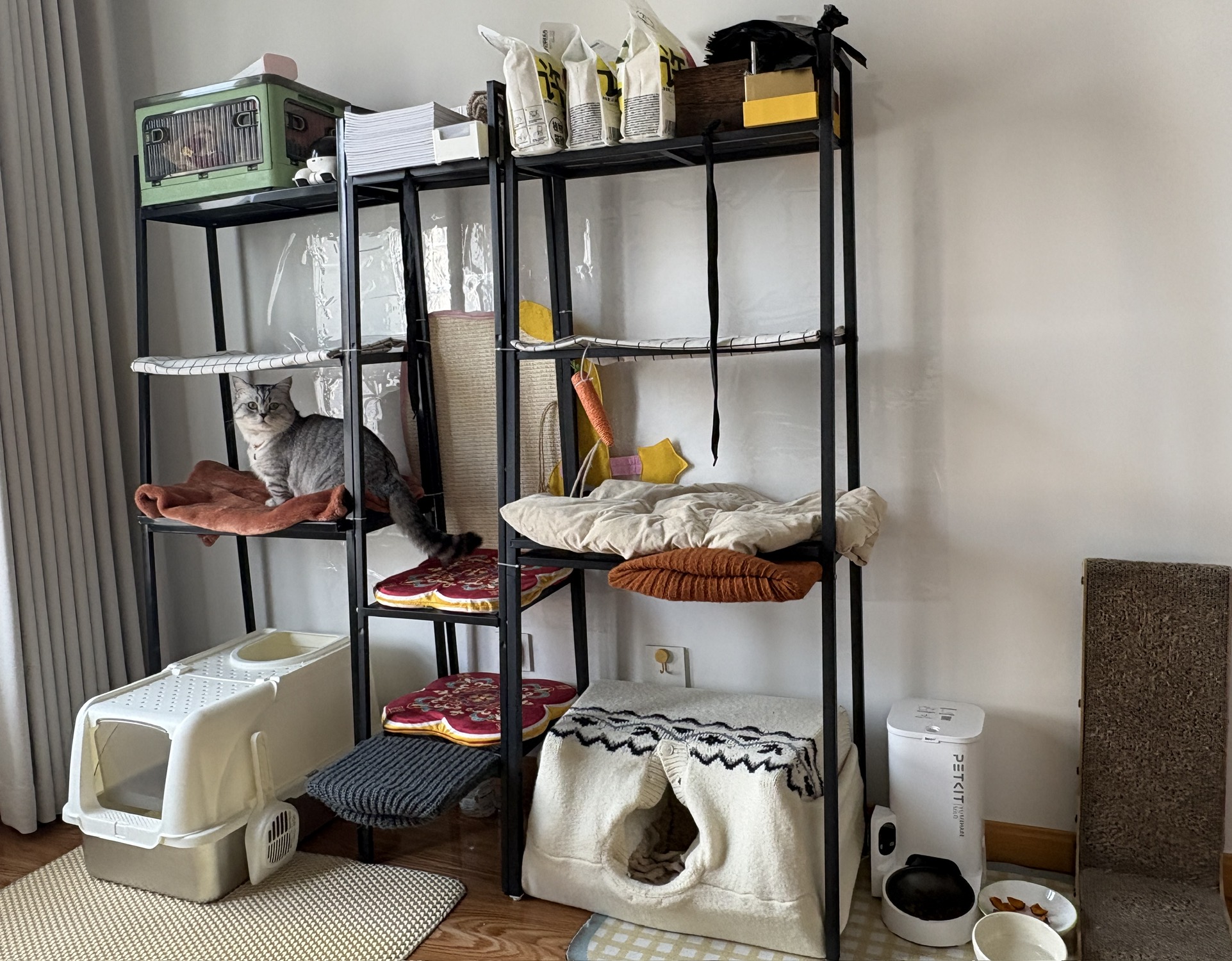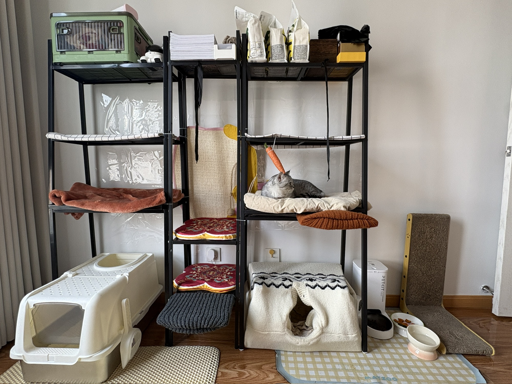 靠老厂家超绝动手能力和勤俭节约美德,把旧书架手搓成阿福三层小楼,获得小猫初步认可