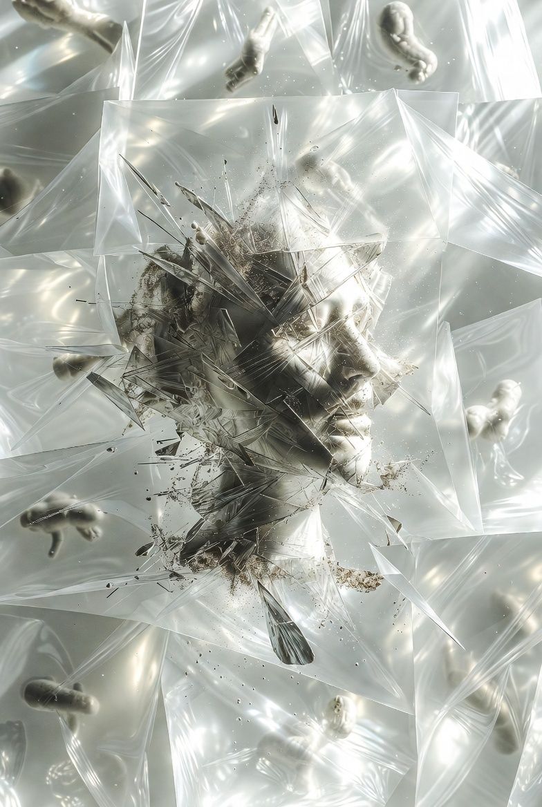 “黑色背景,一个半透明的气球雕塑人脸,被三层折射错位覆盖;每一层都有不同的扫描线方向;内部嵌入荧光骨架;表面浮动着油墨点状噪点;三处空间透视故意冲突;背景零光但边缘出现极细白边光晕。”