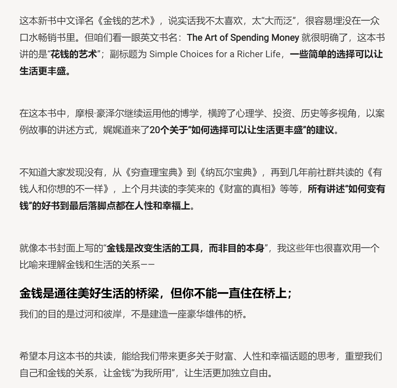制作了一档聊投资也聊情感的播客节目,起名有钱有爱。最受欢迎的一期节目是和好朋友毛远对谈《金钱心理学》这本书,一个半小时的时长有超万人听完,相信会让你所有收获。