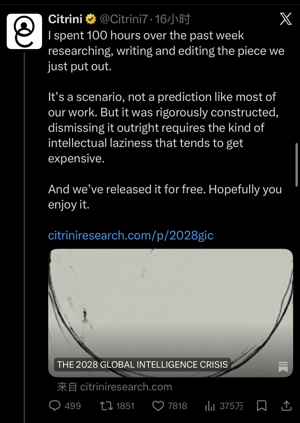 Citrini 昨天在 X 上发了一篇刷屏的研究,预估 2028 年被AI代替的白领/中产,直接影响美国75% 的消费盘子,3 trillion 的私募信贷