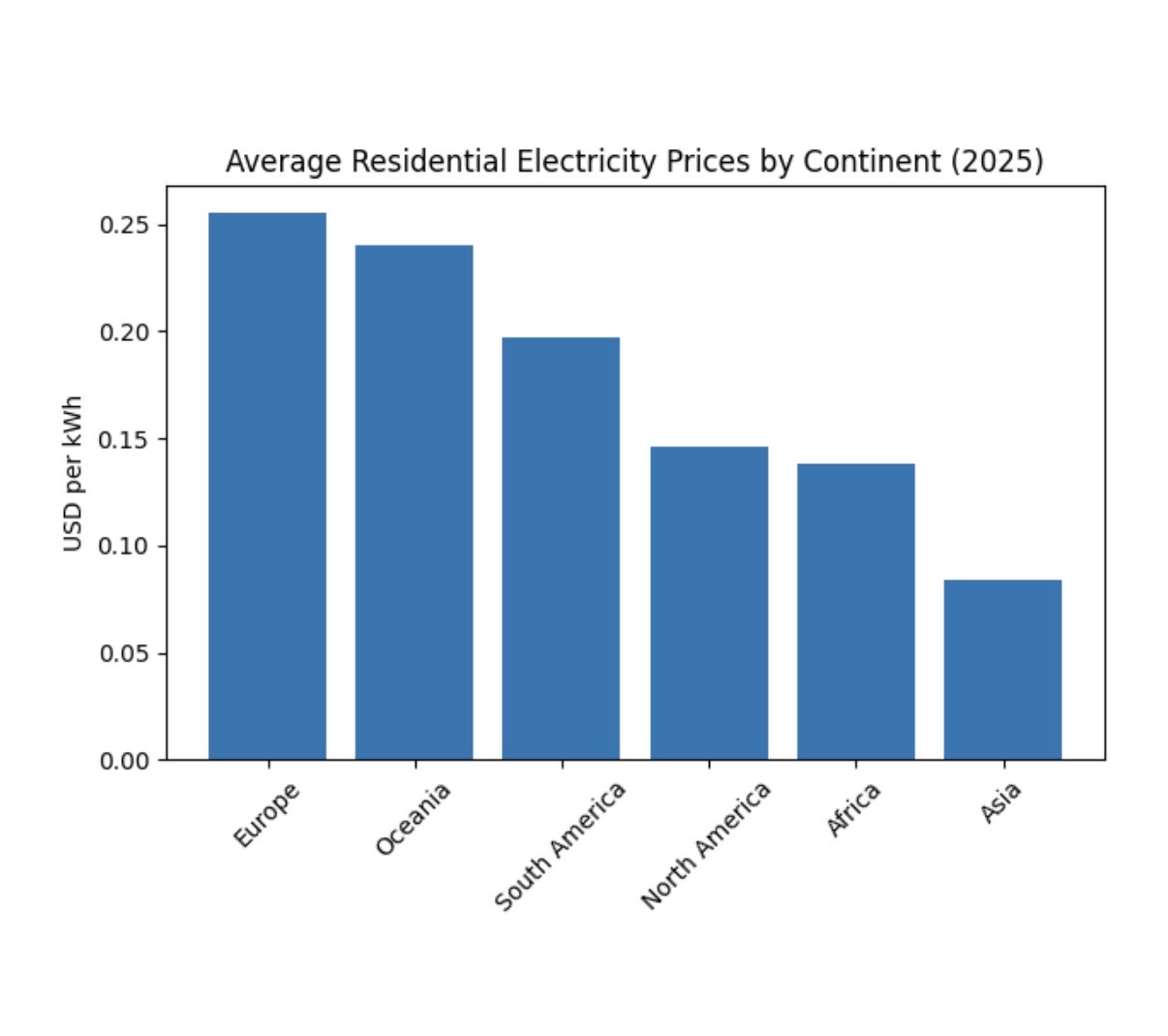 图1是全球主要国家居民电价对比,图2为各大洲平均居民电价对比。(此处我们只对比居民电,工业电计费逻辑比较复杂,单位:美元/kWh)