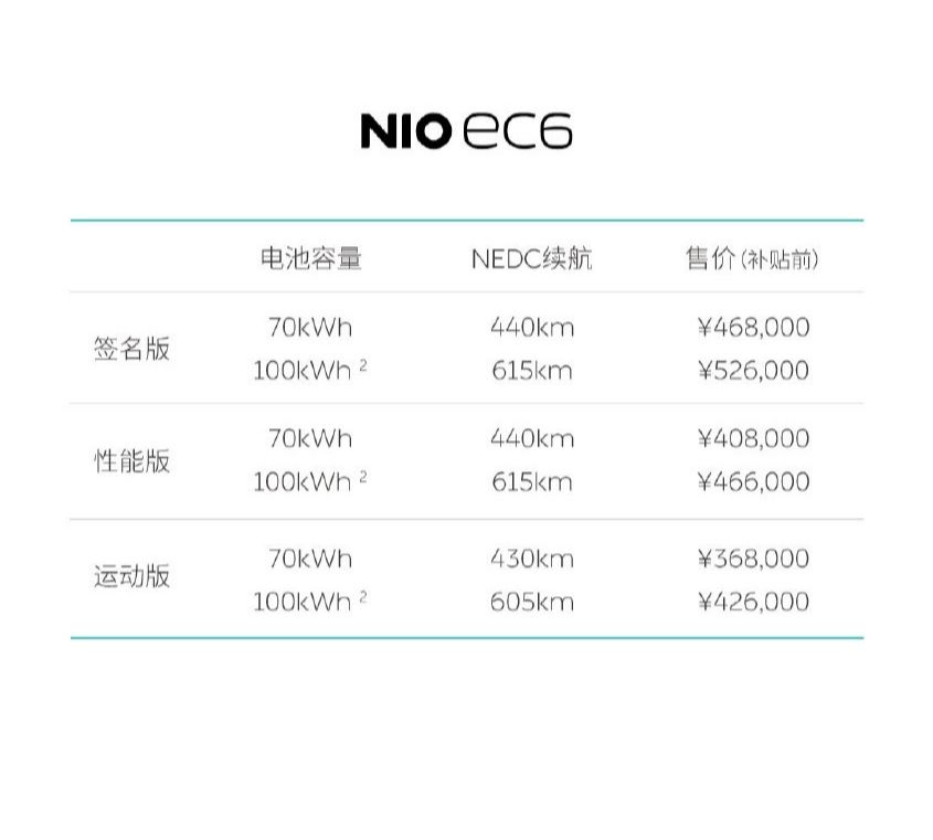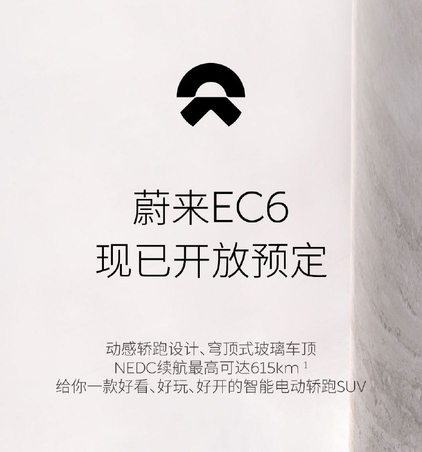 智能电动轿跑 SUV蔚来EC6正式上市! 补贴前售价36.8-52.6万元,首批车辆将在9月下旬开启交付。