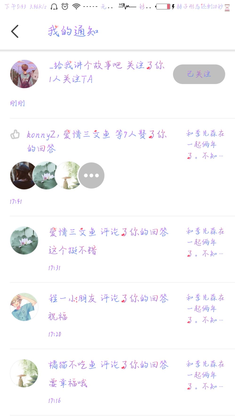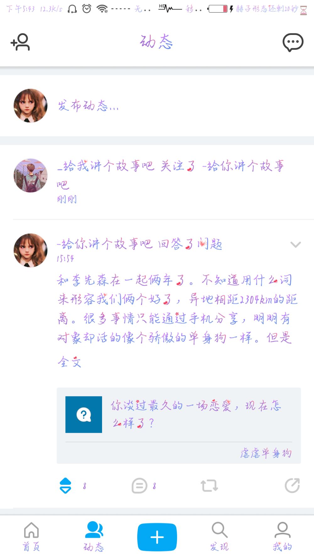 唔,今天和李先森说我在即刻回答了一个问题❤他激动的要抱抱我~可是抱不到诶~因为隔着好远的路呢~然后之后和他哭唧唧说他即刻没有关注我~嘿嘿嘿然后他就很认真的去关注啦~emmmm可能有点智障但是被喜欢的人重视的感觉真的是蛮好的呐*٩(๑´∀`๑)ง*