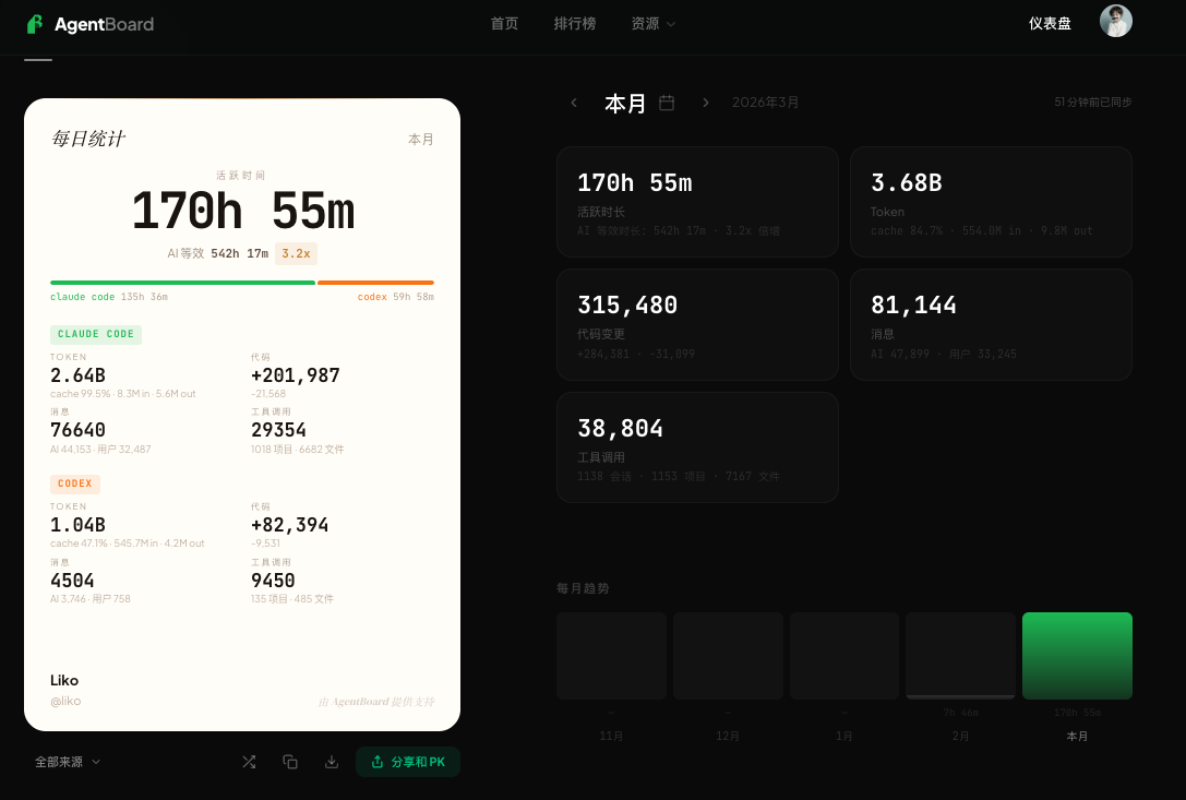yanjun: 大家好(紧张 Vibe Coding 了一段时间,跟我有联系的朋友都知道我同时在 Code 好多个项目。3月初在湾区见了个创始人朋友,一见面我们就在说最近沉迷 Coding,因此有了下面这个项目👇🏻 Agentboard,极其简单地理解,这是一个 Coding 的微信运动排行榜,可以看你 Coding 的时长、烧掉的 token、写过多少行代码 但是我们的 CLI collector 并不会收集你的会话信息、代码内容和文件内容。整个机制是 CLI collector 在本地做聚合,只会把统计数字进行上传和落库,所以请大家安心服用!不会有任何数据风险!我看不到你的代码和会话! 这个产品我很满意,尤其是在整体的视觉和分享卡片的设计上,我花了很长时间跟 Claude Code 磨合,欢迎所有对自己 Coding 数据好奇的朋友试用嘿嘿(目前仅支持 Claude Code 和 Codex ),俺烧掉的 token 数是 4.83 Billion🫡 🔗链接: https://agentboard.cc