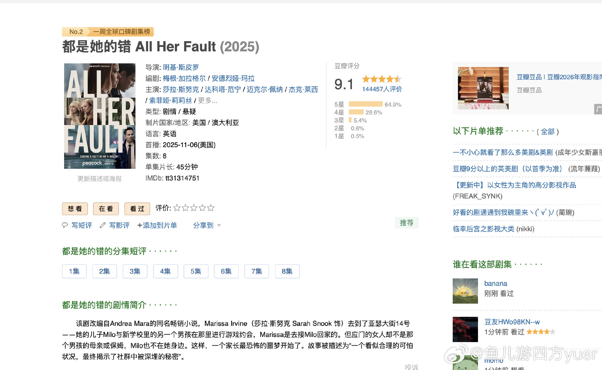 豆瓣评分9.1分,完全没有想到的结局和凶手。