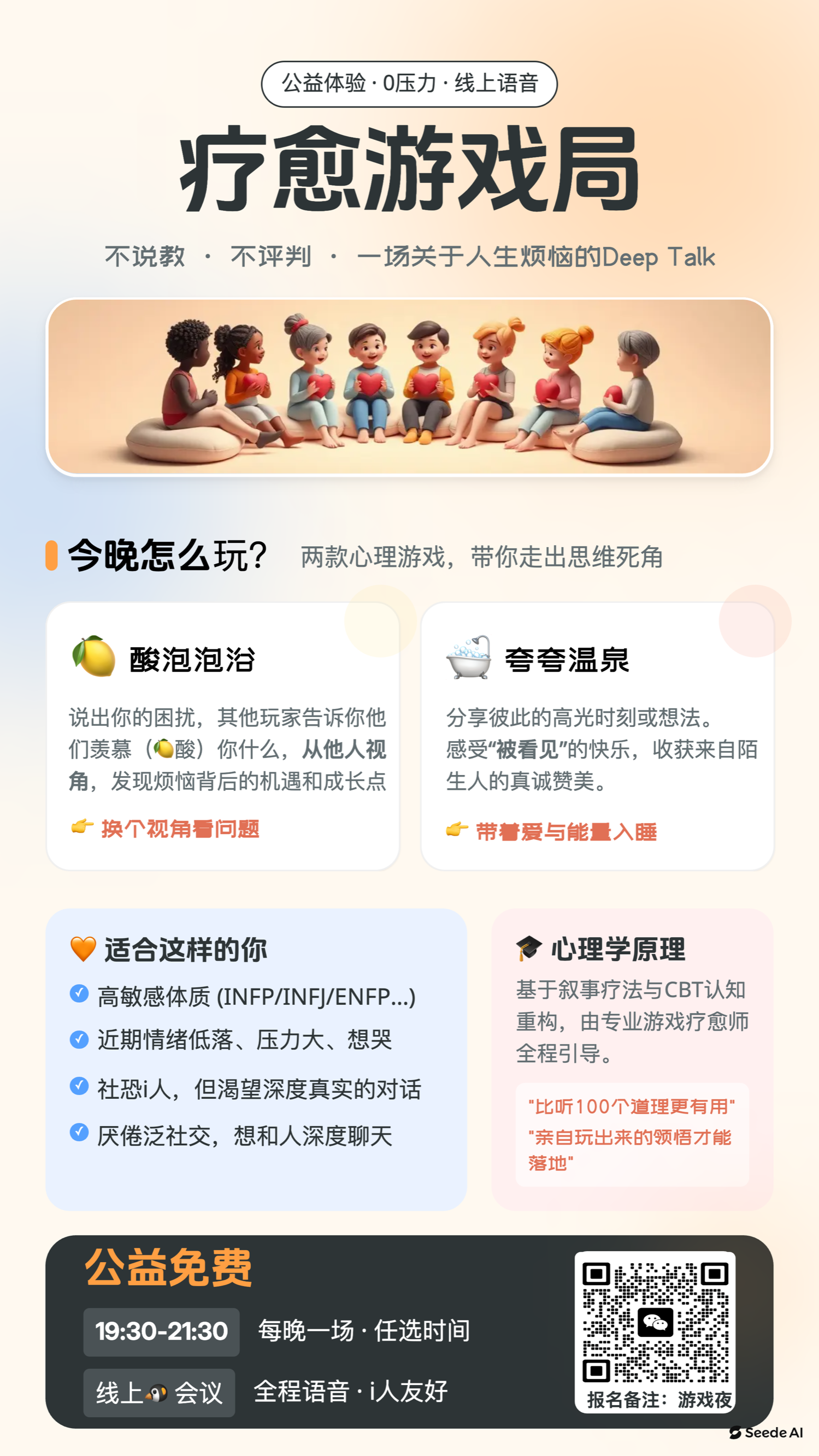 简单讲,就是以心理学x即兴戏剧的理论为基础,融合游戏思维和游戏化的互动方式,帮助大家学会应对情绪内耗、亲密关系、自我接纳、未来迷茫等人生课题。