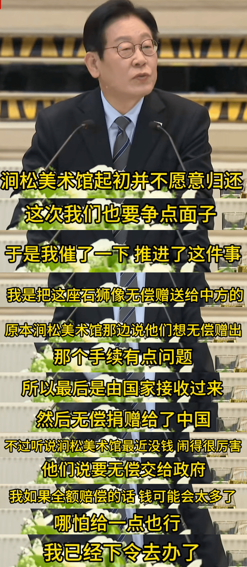 李在明在这次访华前,紧急动员民间美术馆(涧松美术馆)向中国无偿捐赠了一对日占时期从中国流失海外的皇宫石狮子(现在价值连城),事后他才得知涧松美术馆实际经济状态不是很好(食不果腹),于是下令由韩国政府出面给涧松美术馆一定的经济补偿。