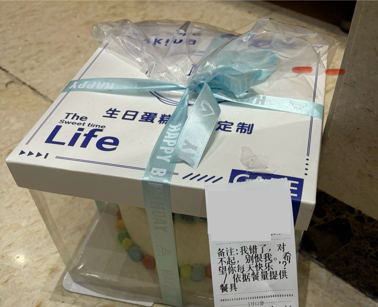 公司外卖柜旁的蛋糕,中午上楼时在,晚上这个点下楼,还在,想到情人节垃圾桶里的玫瑰花,一看,果然是。
