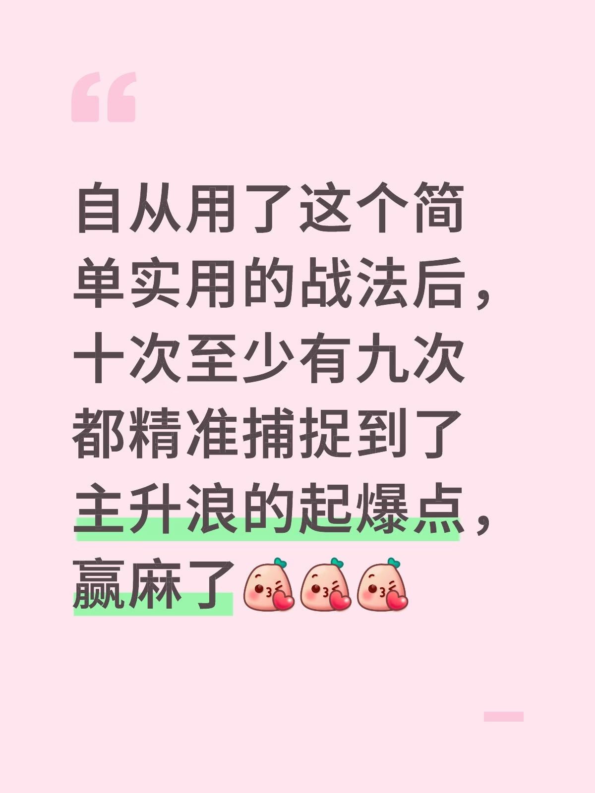 你赚的是趋势突破的,短期的高爆发的钱,而不是左侧交易的抗跌受委屈的钱。小资金慢慢做大,就这一个核心逻辑:滚动复利,只做右侧,只做最强,必设止损,快进快出。