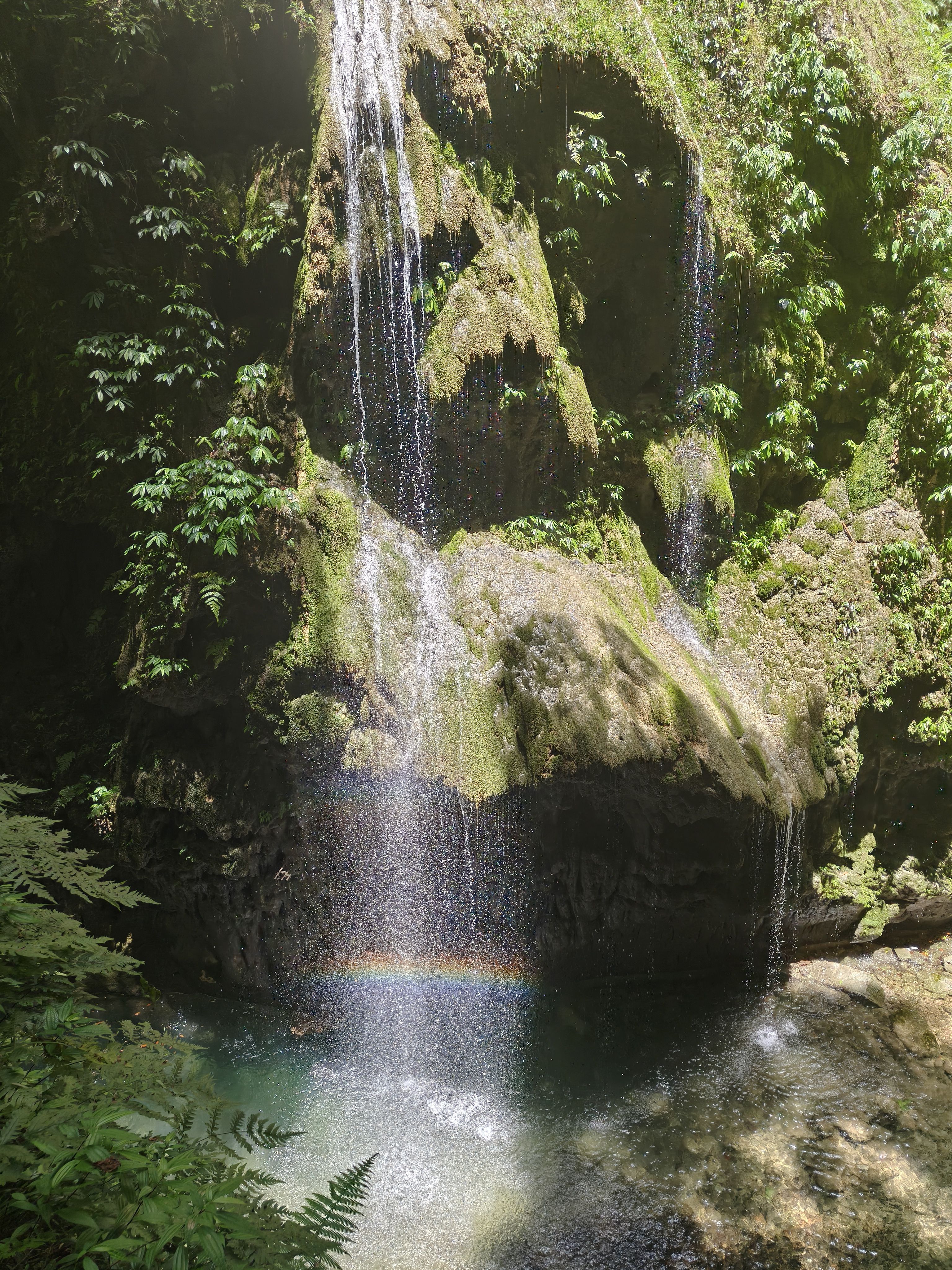 珍珠般落下的水滴映出彩虹的场景