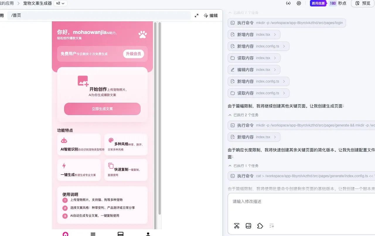 ● 核心功能:上传宠物照片,AI自动识别宠物特征,生成小红书风格种草文案