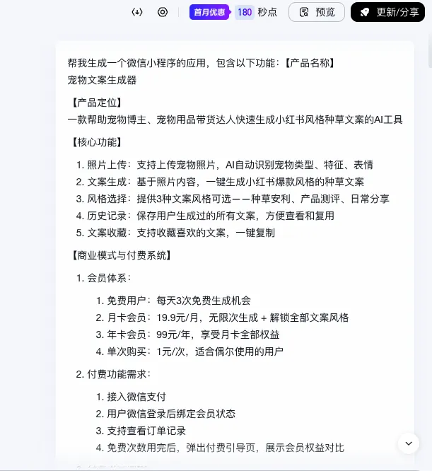 我把整理好的需求(包括付费逻辑)复制进去,点击生成,秒哒会基于我的需求,先生成一份完整的需求文档。