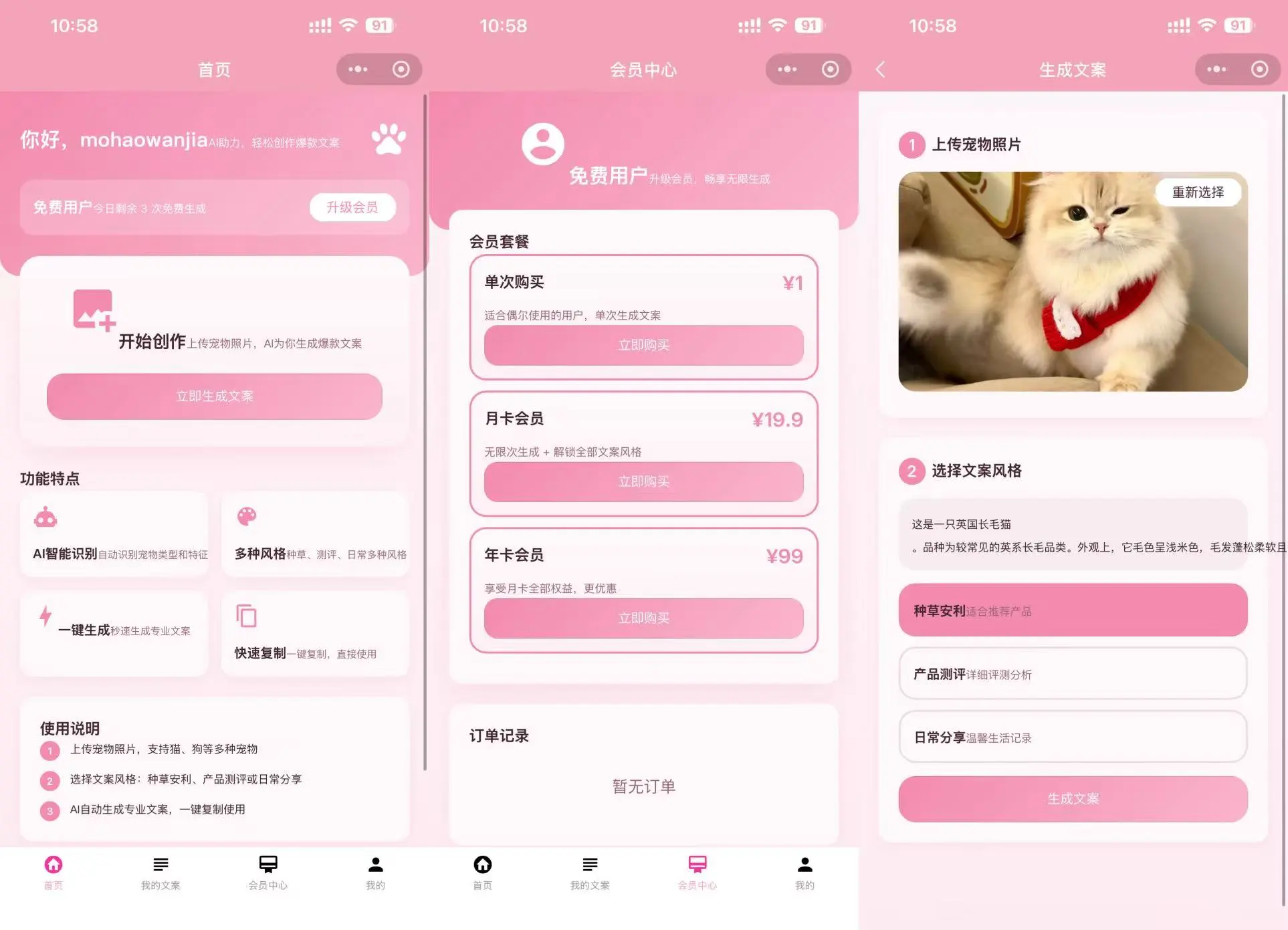 ● 月卡:19.9元/月,无限次生成 + 解锁全部文案风格