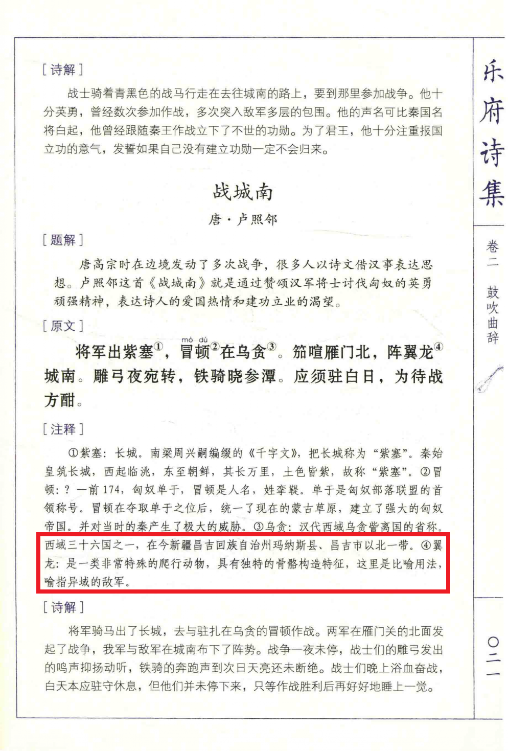 这个倒是不是课本里的,知乎上有人考证是 出自 16 年黄山书社出版的《图解乐府诗集》,而且同样的错误还不止这一本书,像 09 年万卷出版社的《乐府诗集》,10 年吉林出版集团的《国学典藏书系 乐府诗集》以及 14 年新世纪出版社的《崇贤书院 释译:乐府诗集》等等全是一模一样的错误… //