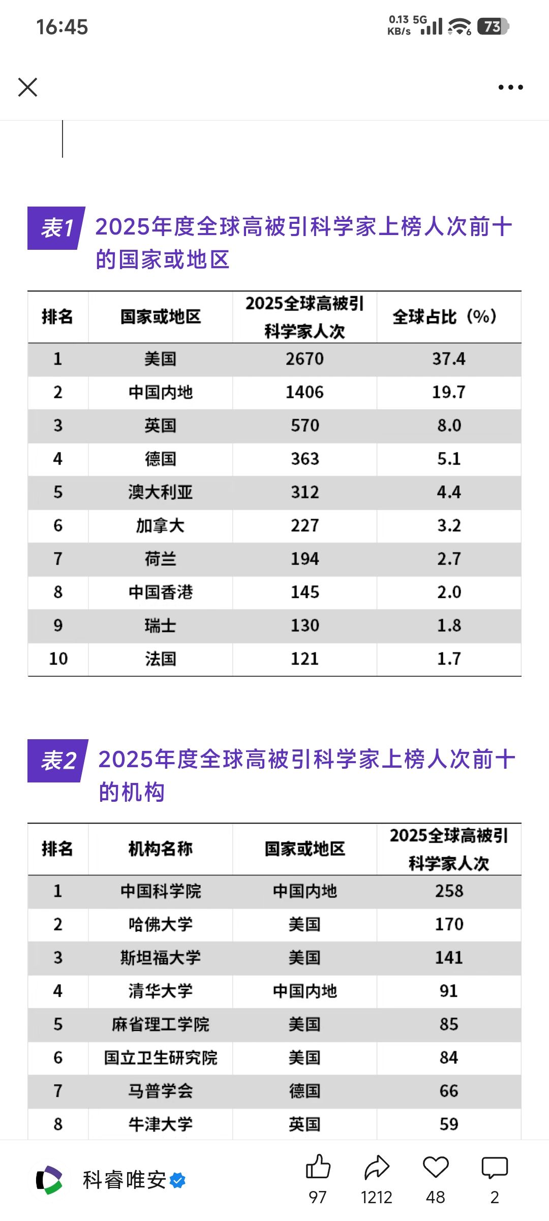 美国高被引学者数量全球占比确实断档第一,不过近年来总体呈下降趋势,其他国家不超过 10% 的数据不确切…