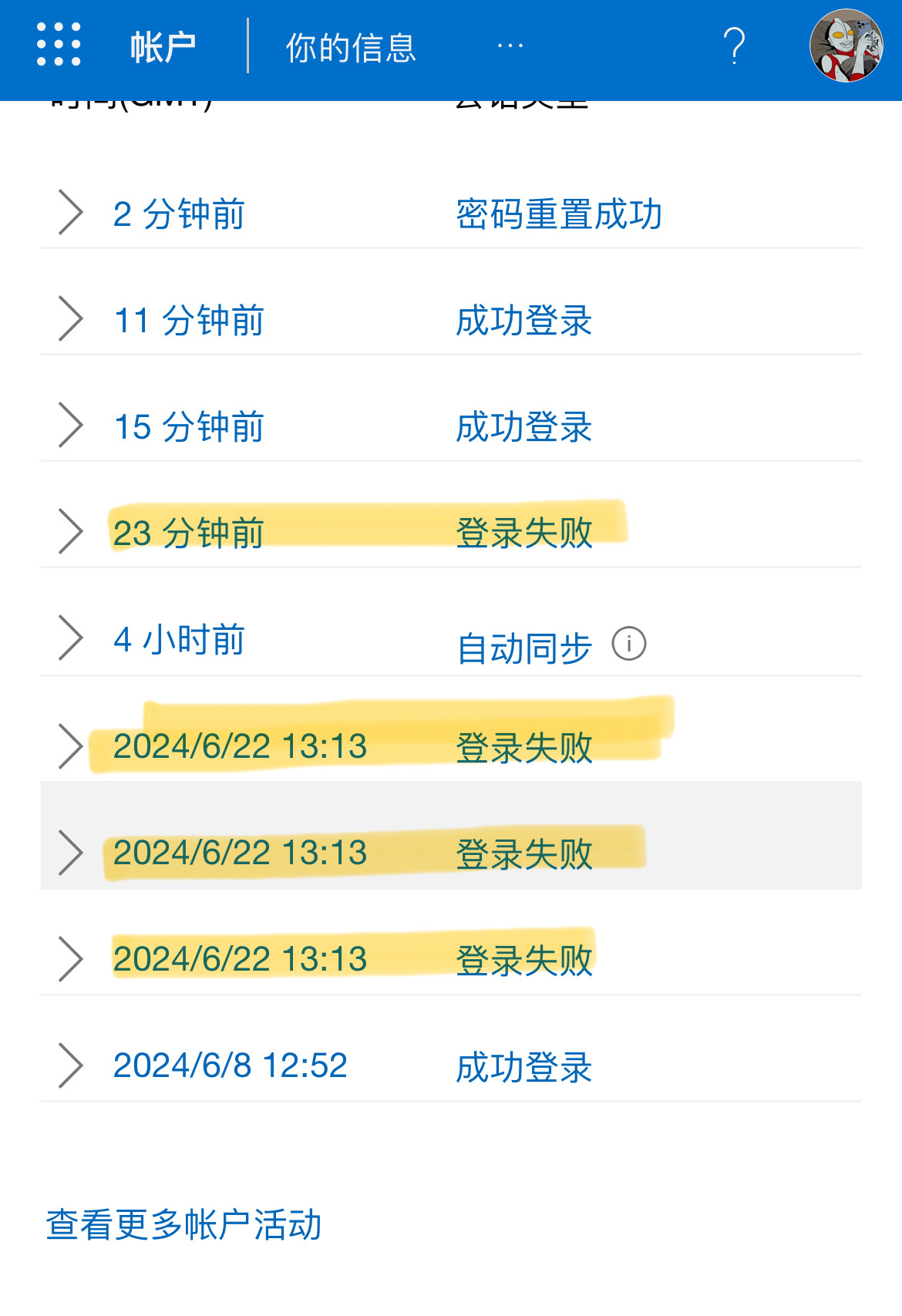 其中比较细思极恐的是,这个盗号的人输入用户名是我的手机,和正确的邮箱账号。前面 6 月的三次都是密码错误,23 分钟前的那个是我用电子令牌直接拒绝登录的。