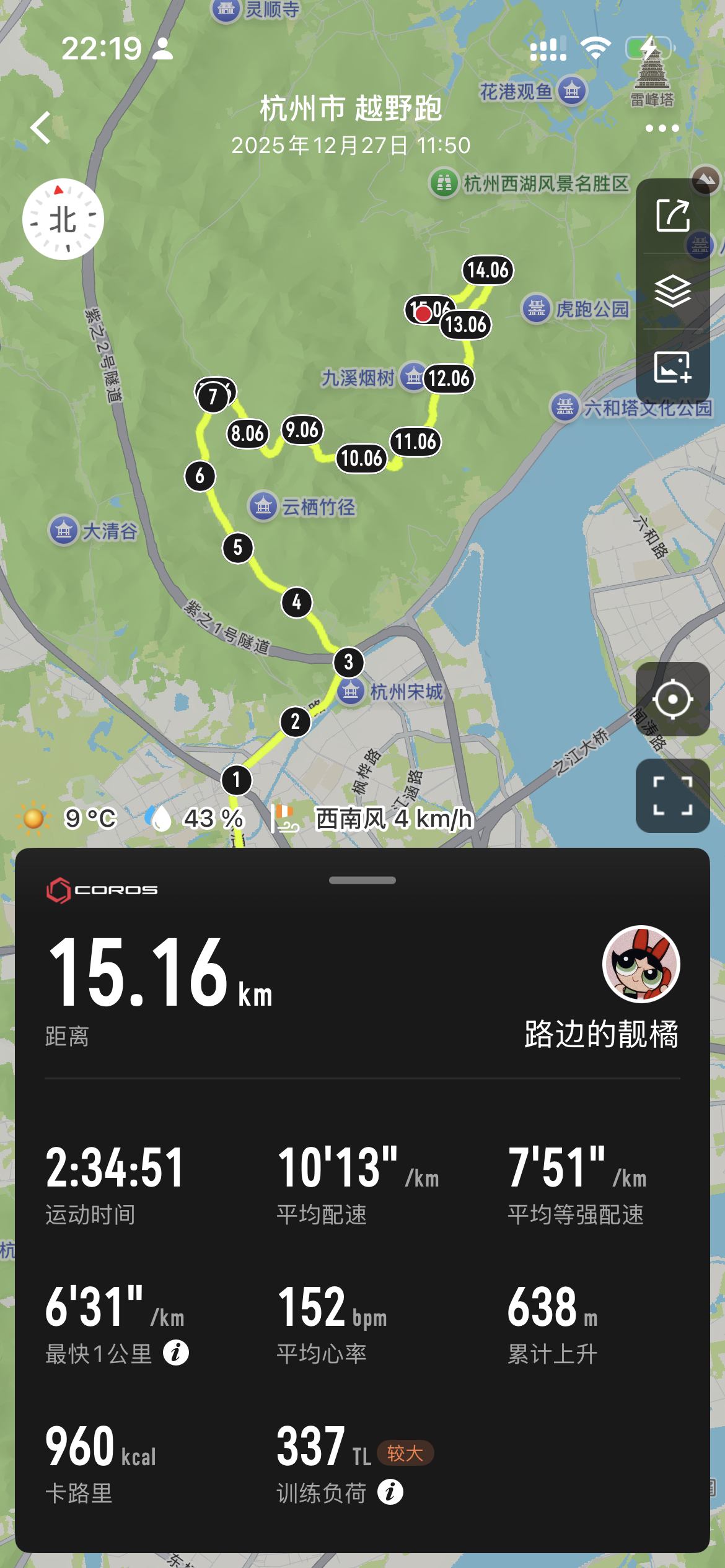 今年路线前面是一段很长的路跑,一直是背阴面,没有大片的阳光,只有偶尔从间隙里透出的阳光,直到跑到了马家坞看景台,杭州,太美了!我的心那一刻都亮了。当然最后两个大爬升真的是把我干懵了[失望R]
