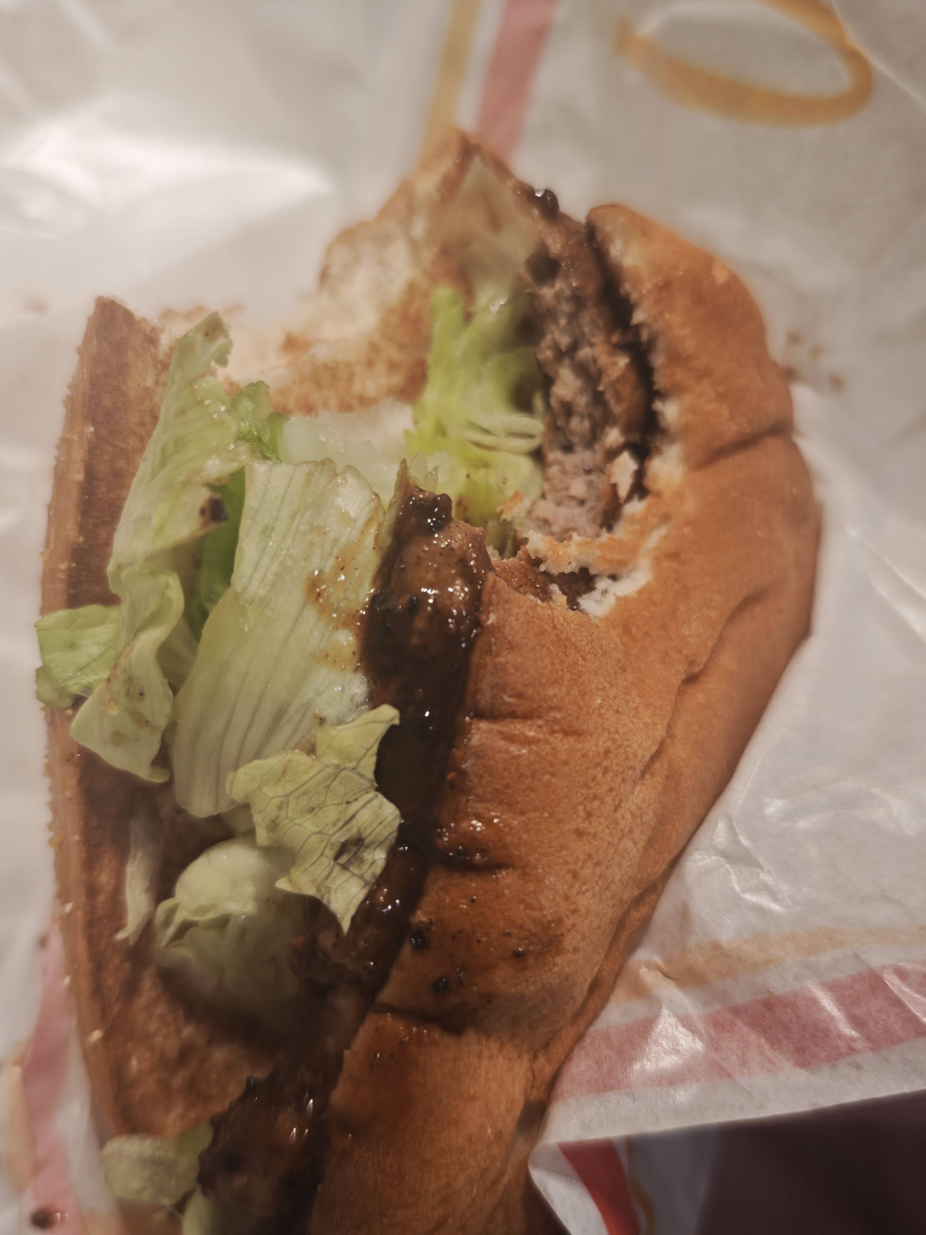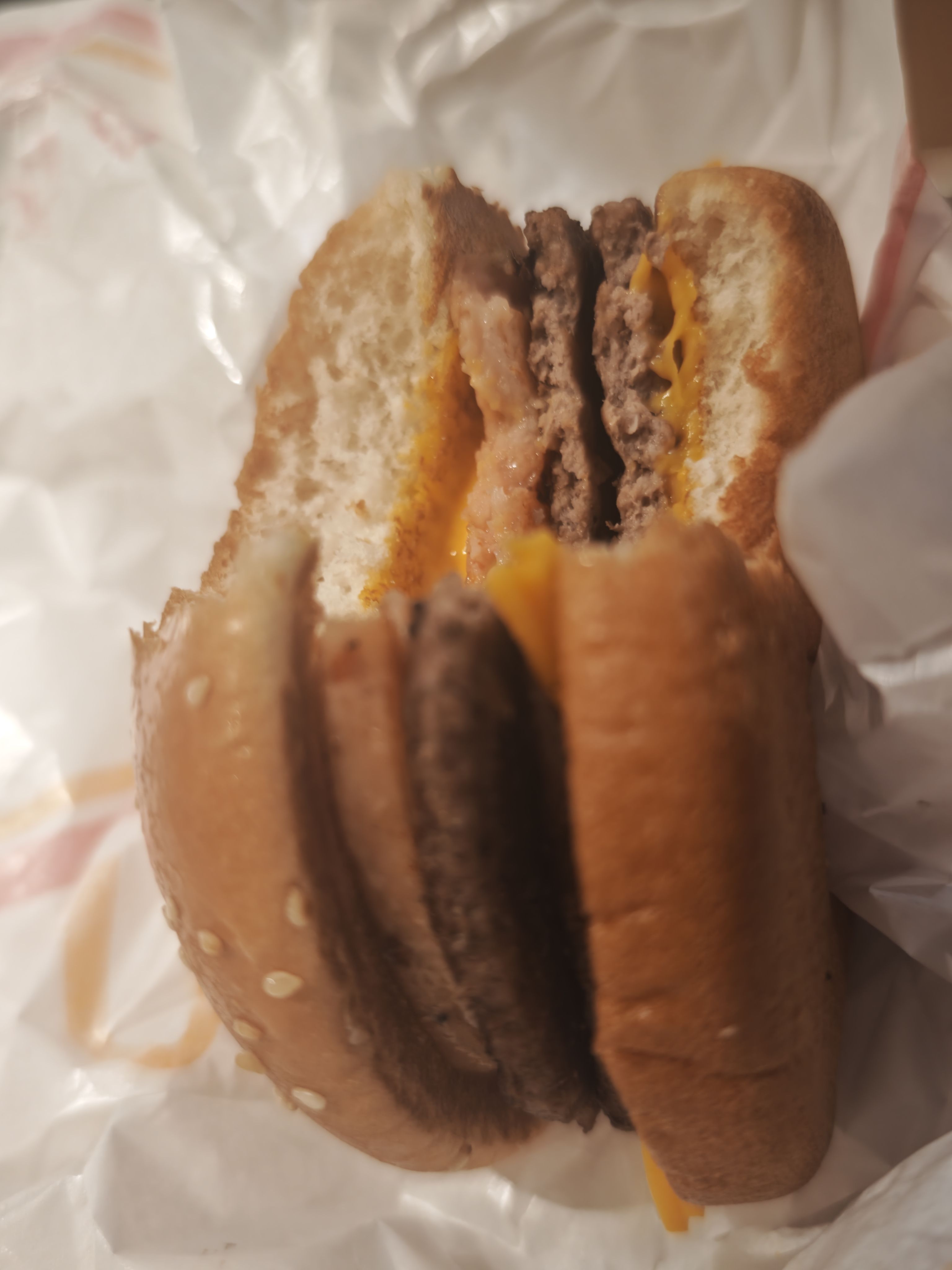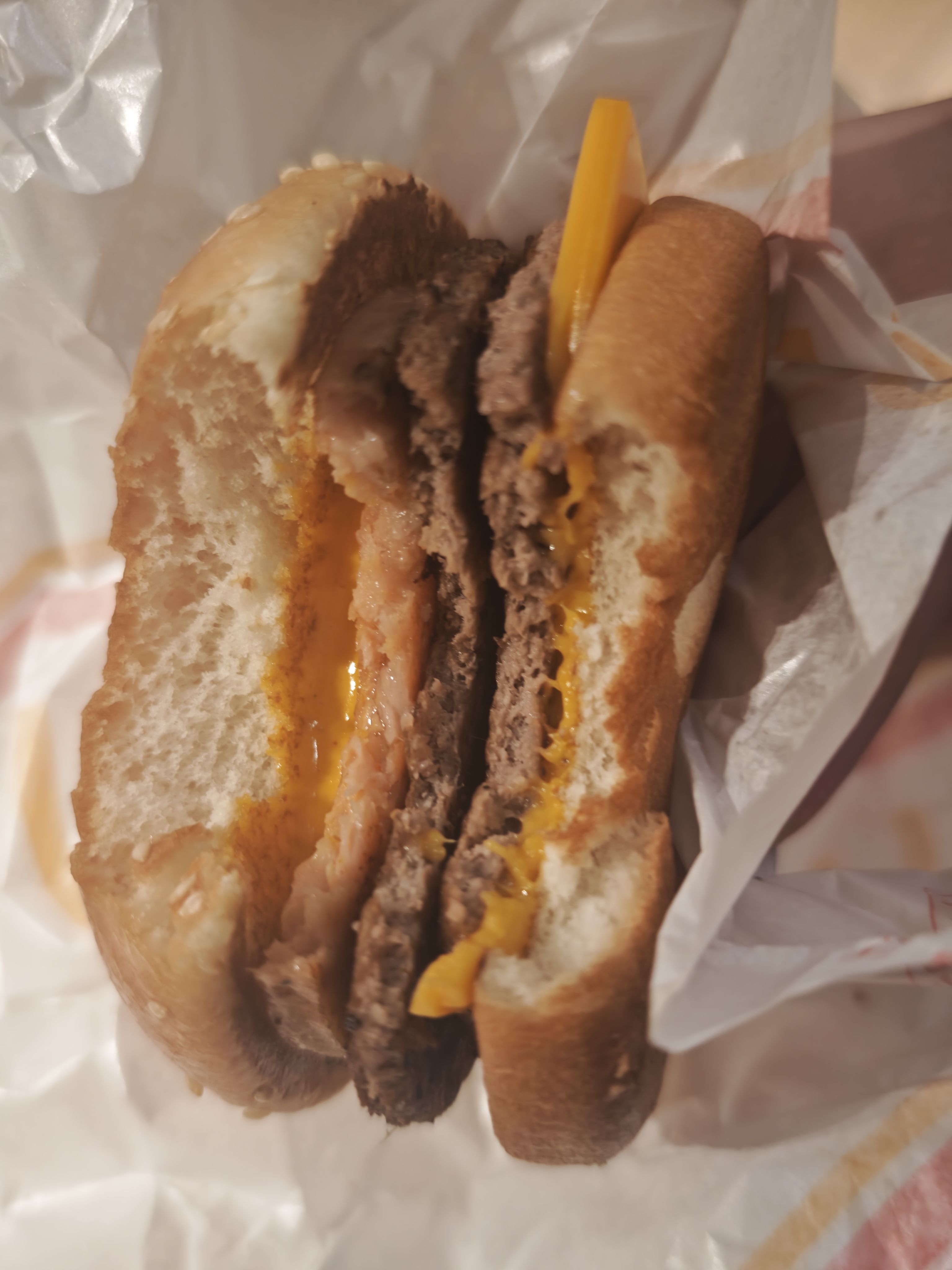 那个三层堡,不如点个培根芝士双牛,自己再加块午餐肉。那片肉鸡肉含量太多了