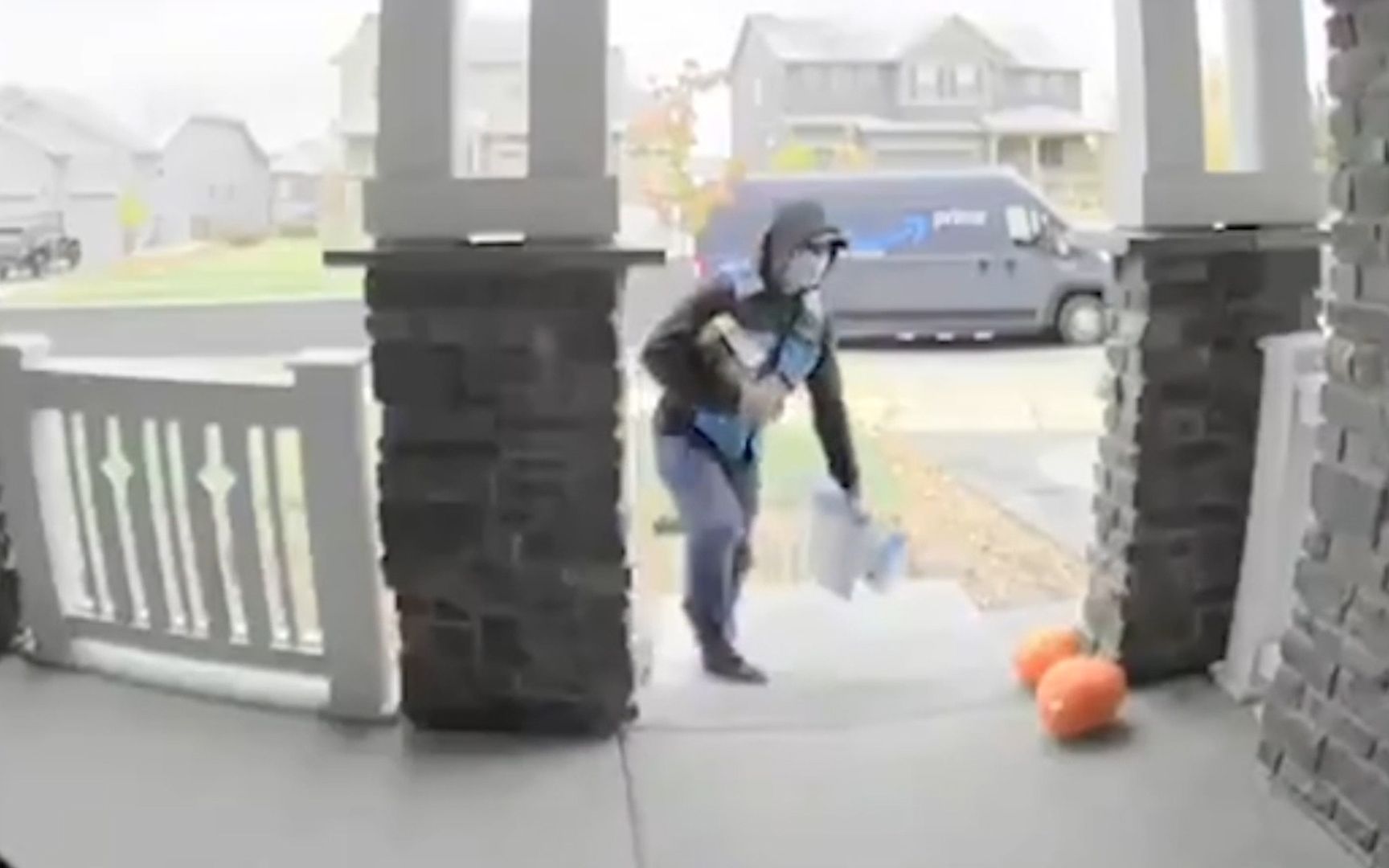 太难了!美国小哥送快递在同一位置连摔2跤 躺门口惨叫惊动屋主