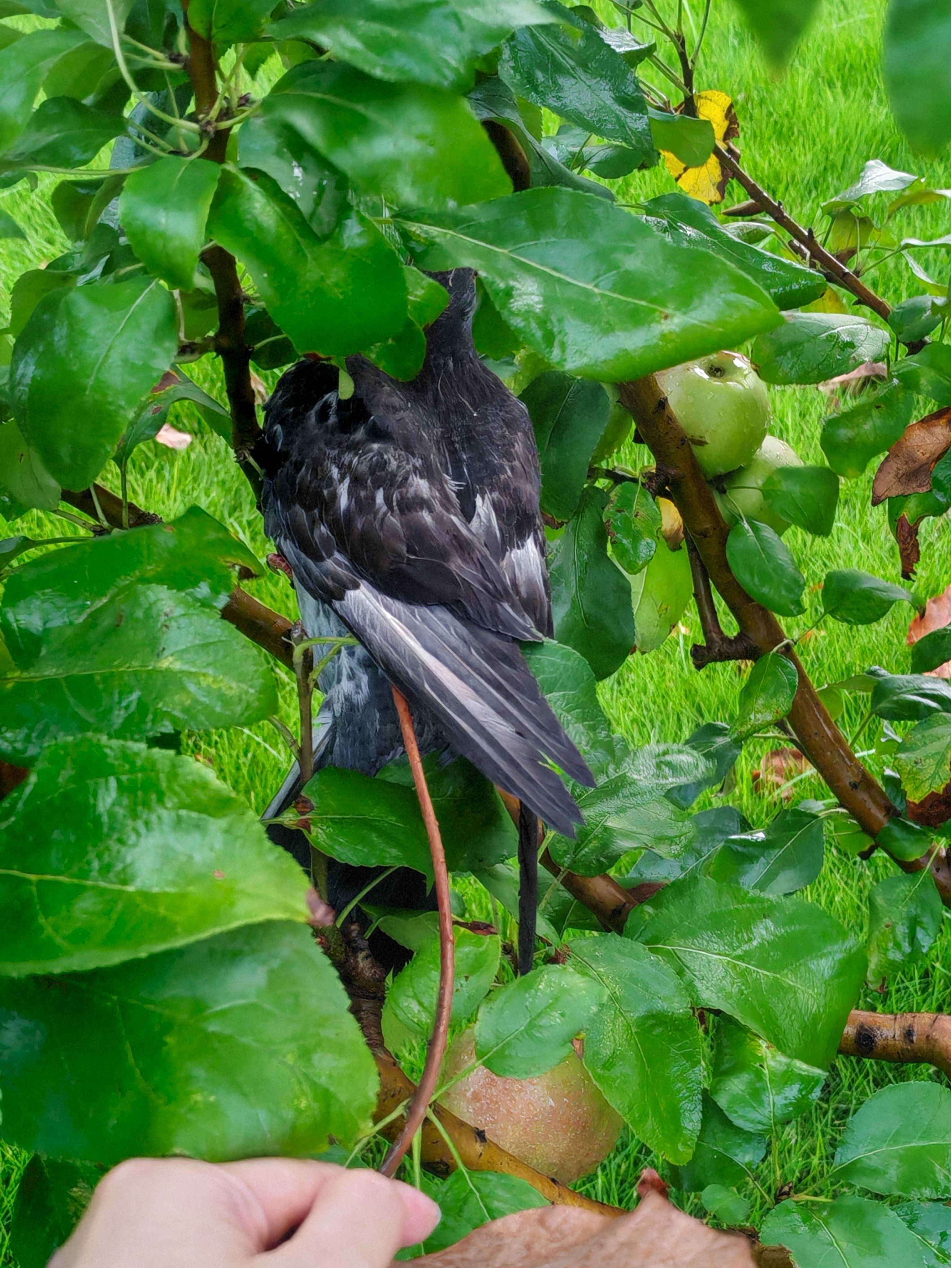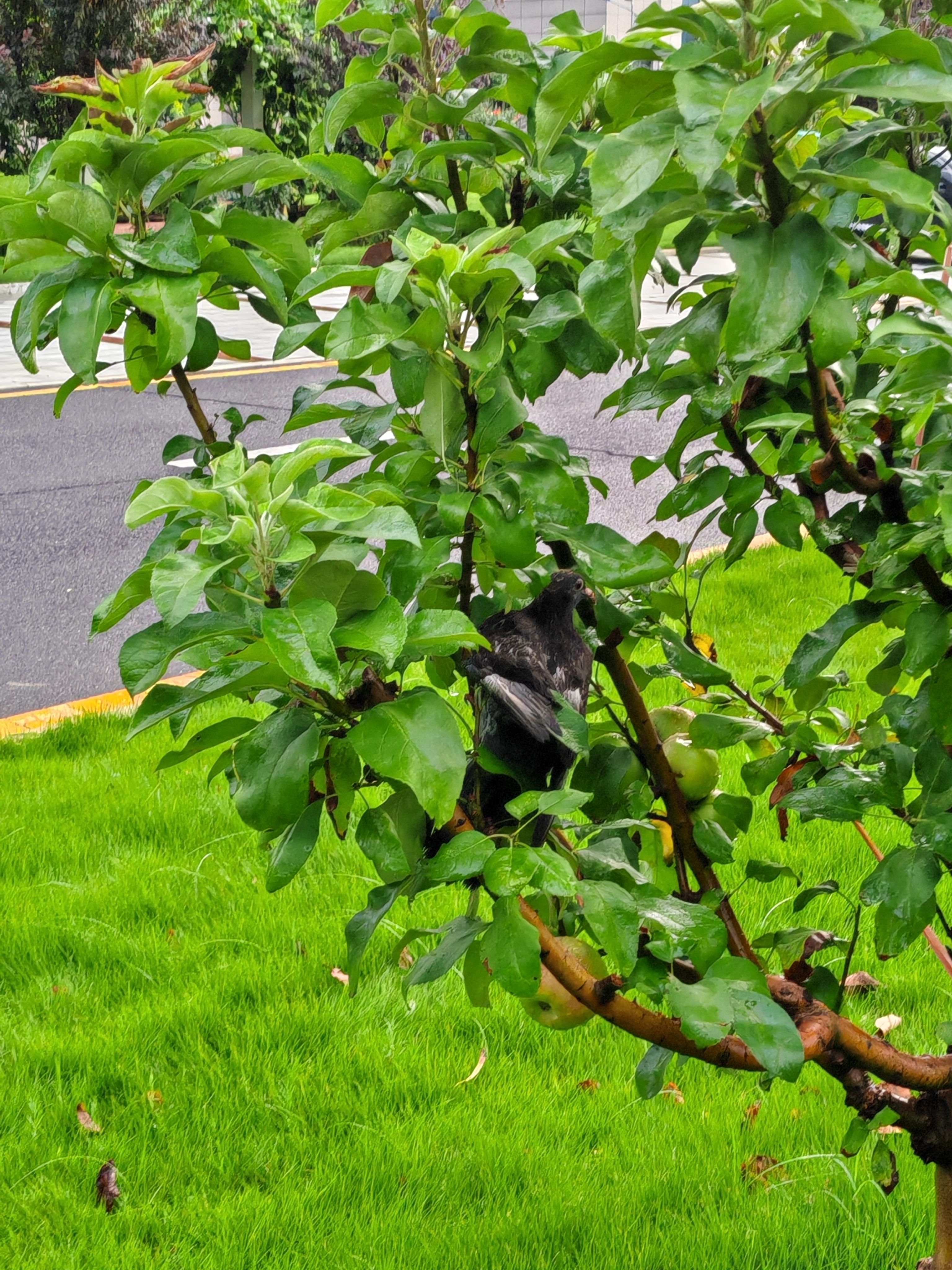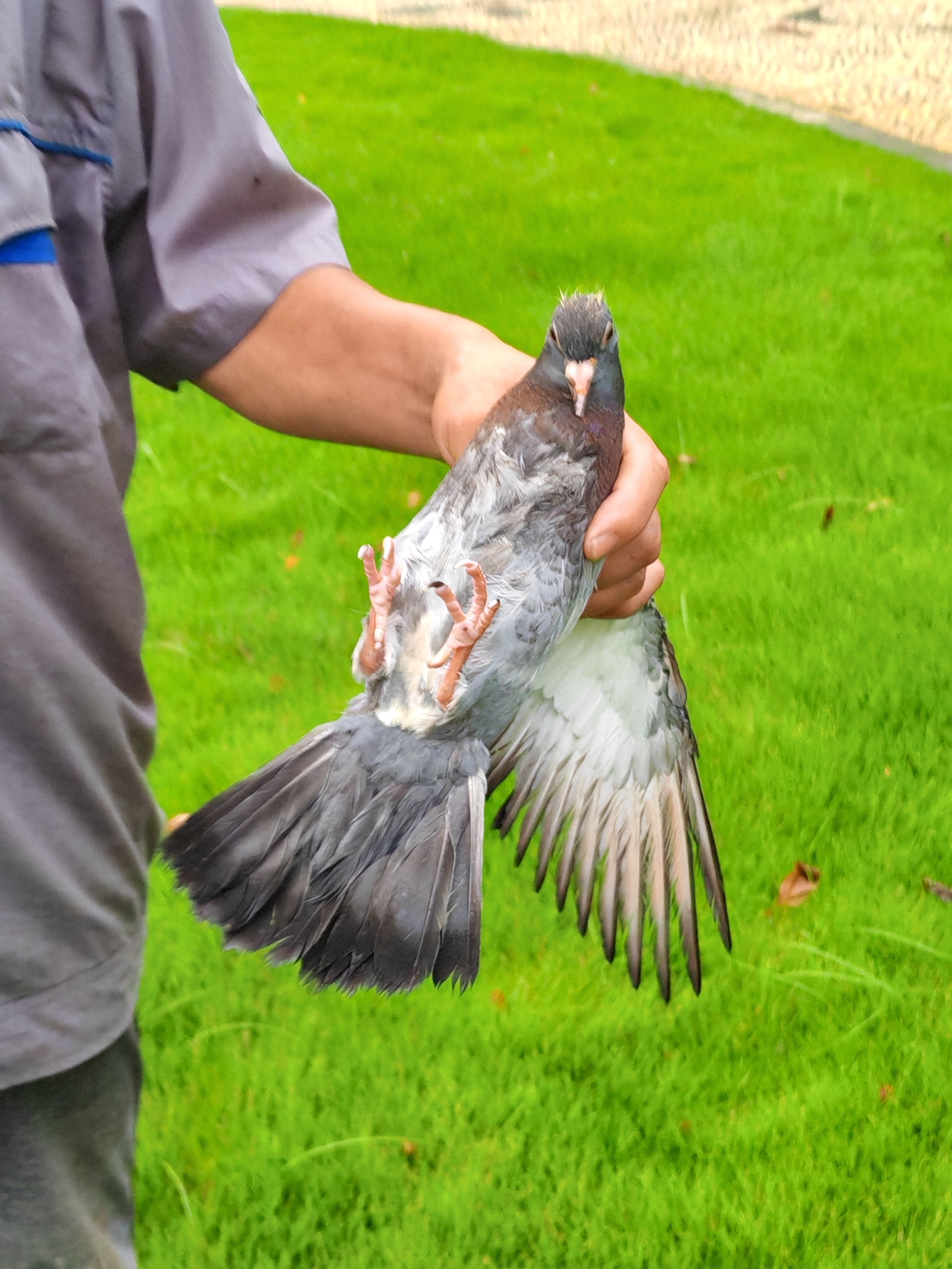 Part1⃣ :雨停了,准备下班。无意中发现一只笨蛋咕被卡在树枝间。看样子被困很久了,靠近它半米都不挣扎。捡起地上的大落叶杆准备英雄救美,正好来了两位师傅。一个老师傅帮忙把鸽子捧了下来,给我说是只小鸽子呢。因为下雨,这是今天被困的第二只啦!没受伤的笨蛋咕。看它的发型也是焦头烂额的。不用这么专注的看我,我知道,我是你的的神!