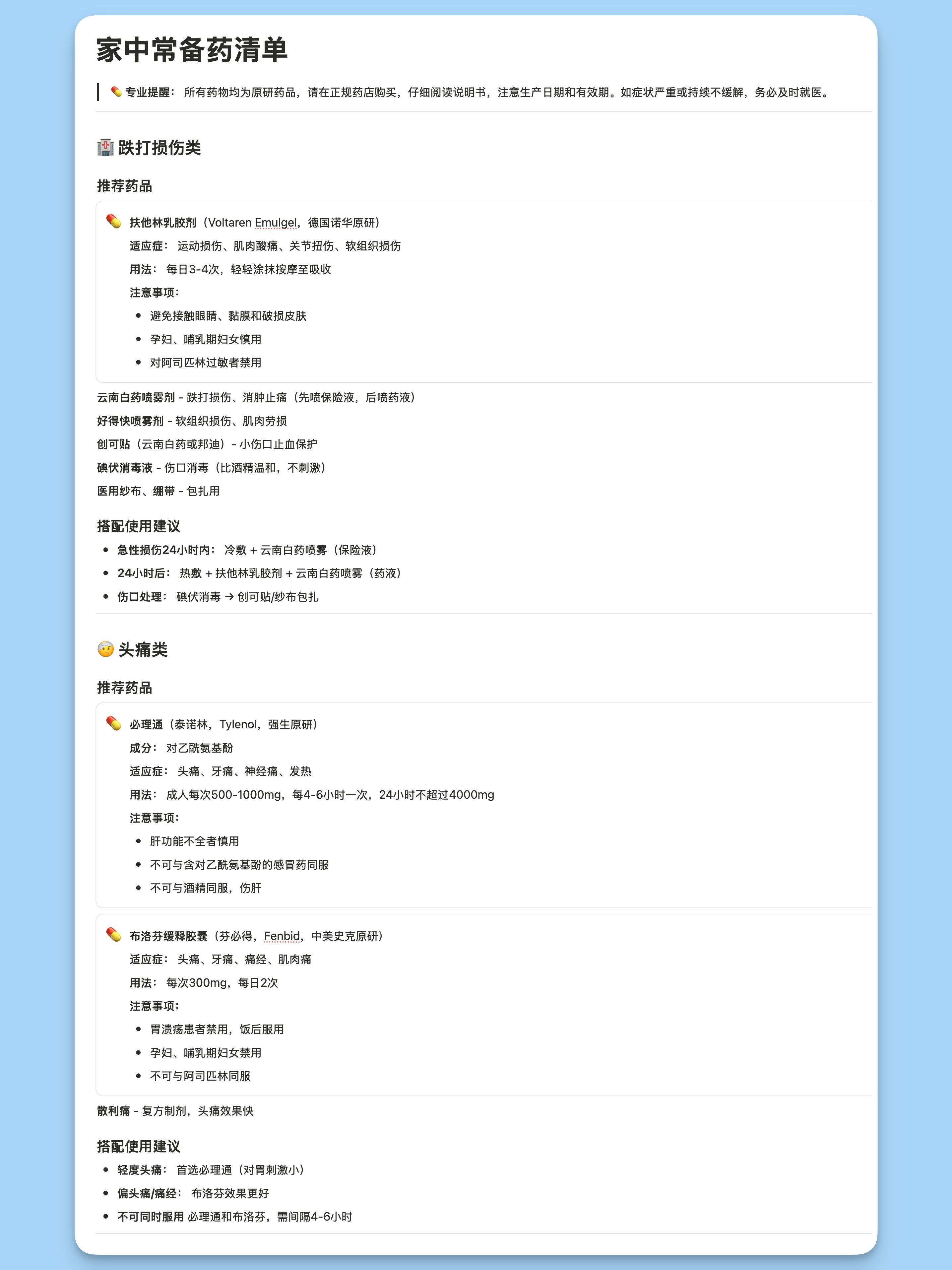 Notion AI + Claude 制作了一个家中常备药和维生素补剂。还会告诉你适应症、用法用量和注意事项,还有搭配使用建议。还有经期的自我照顾、注意事项,和维生素补剂的一些使用建议和效用说明。