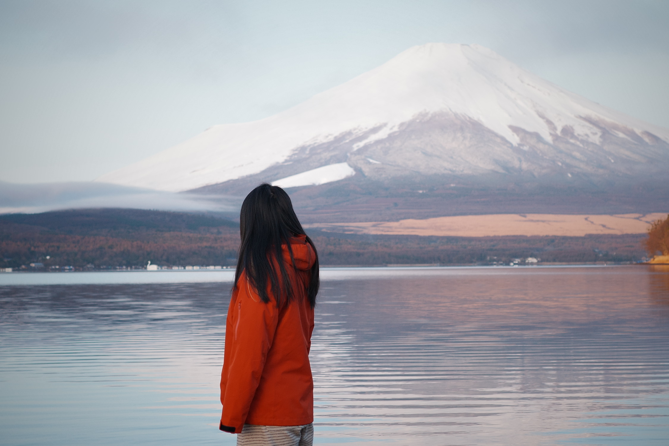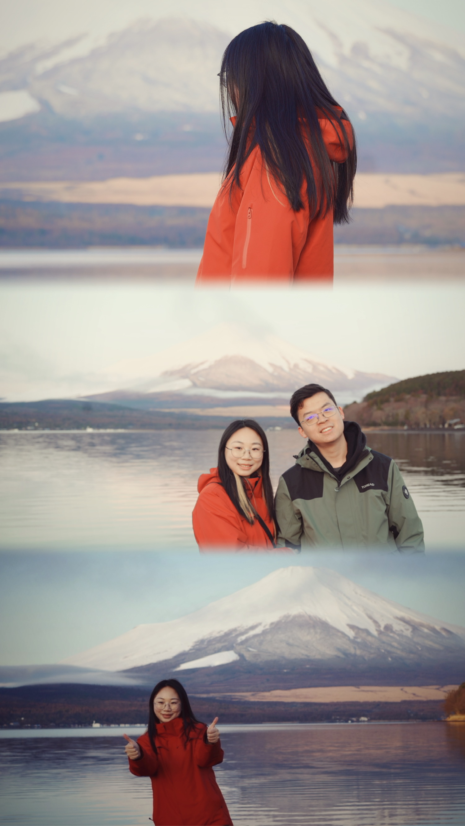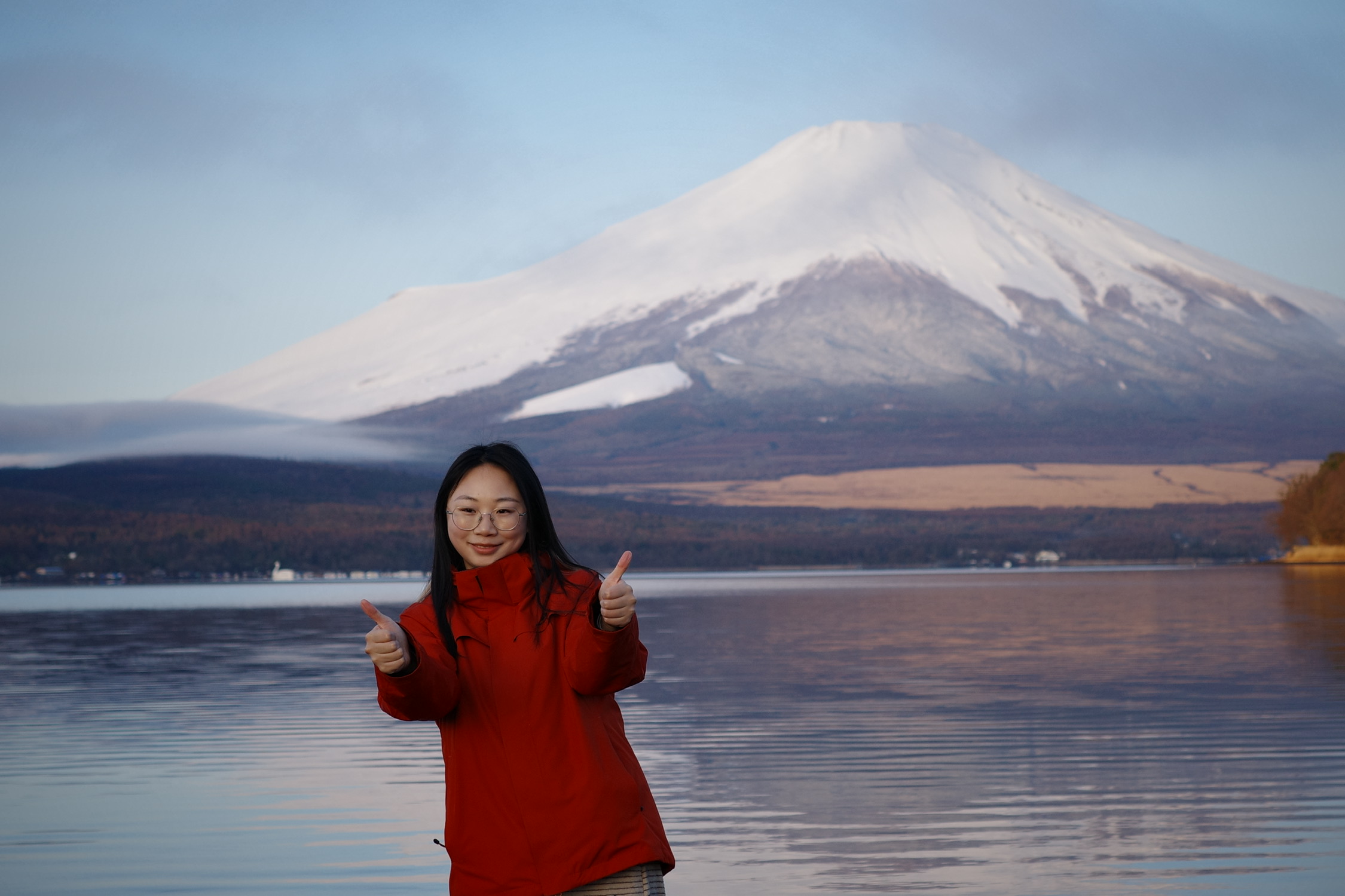 阳光真的在风雨后,第三天早上我们4点半起床,看到了粉色富士山,激情拍照一小时,咔咔出片。看着在富士山下不同的人凹着不同的造型,我真的感叹,这样平静美好的生活,真好。后来我们在山中湖骑行,也是非常有趣,哈哈哈不愧是我,裙子滚到了车链里,最后还是广广折返回来帮我把裙子扯了出来,英雄救美小剧场打卡成功。路上偶遇了来自台湾的叔叔和阿姨,沟通交流品鉴美图后,给她们airdrop了粉色的富士山,这大概就是美美与共吧。