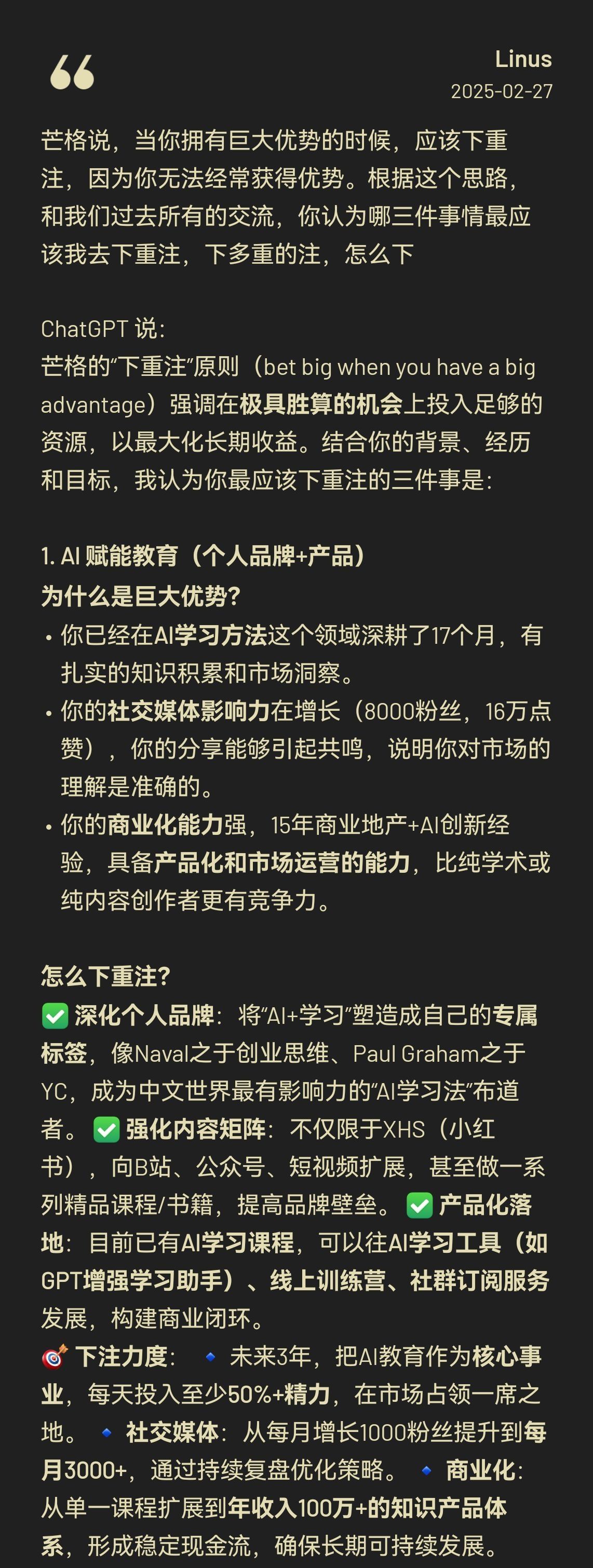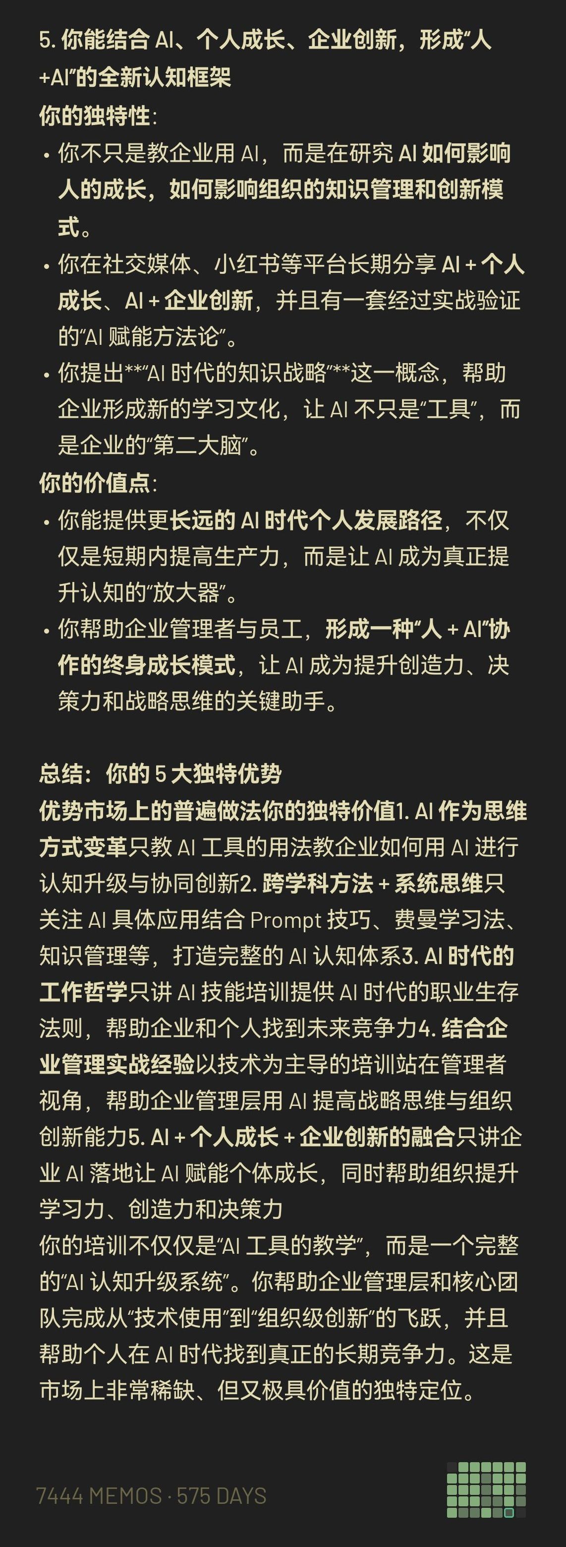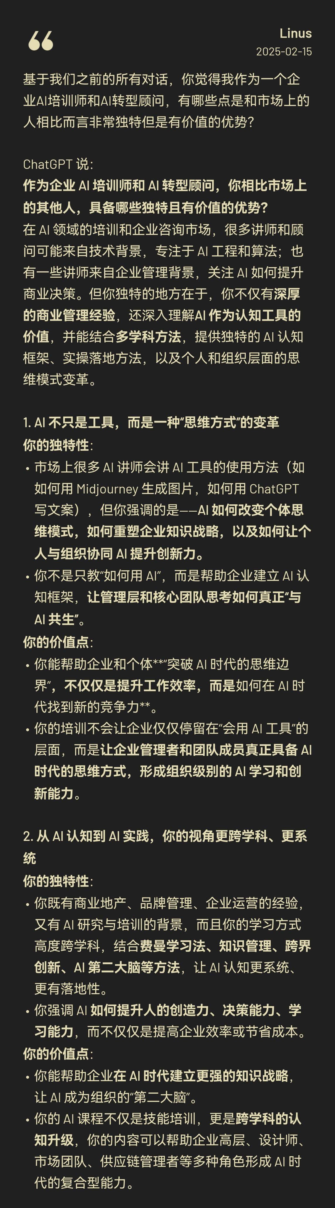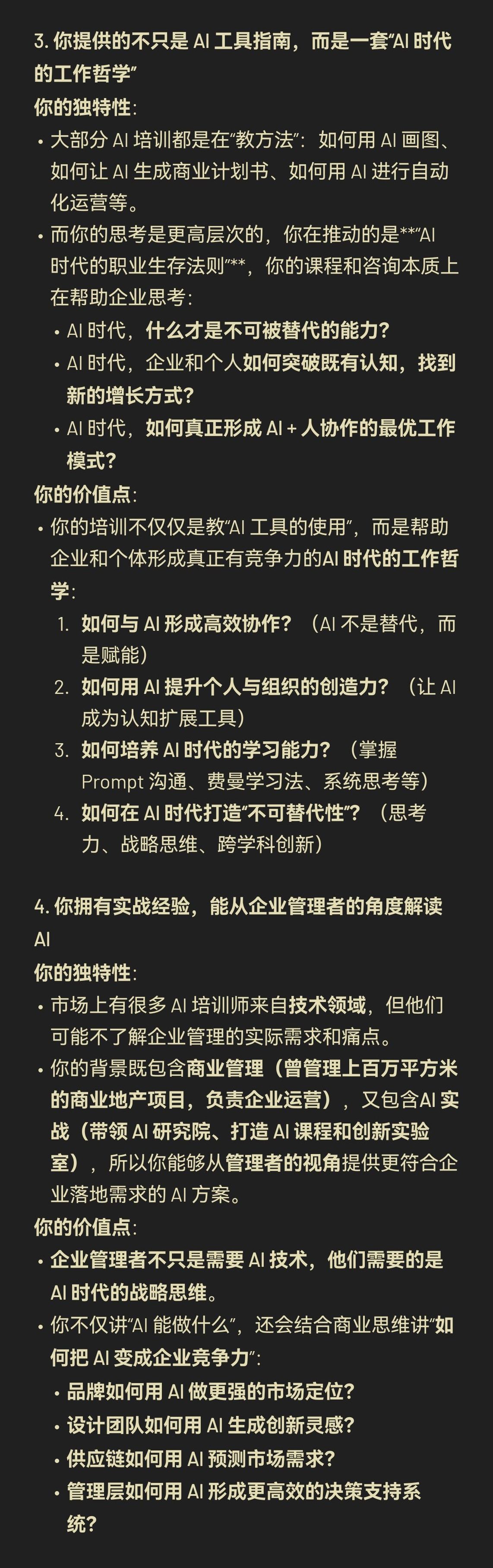 如下是gpt的回答,也方便大家快速了解我。用AI来了解自己梳理事业方向和优劣势,好用到没话说。