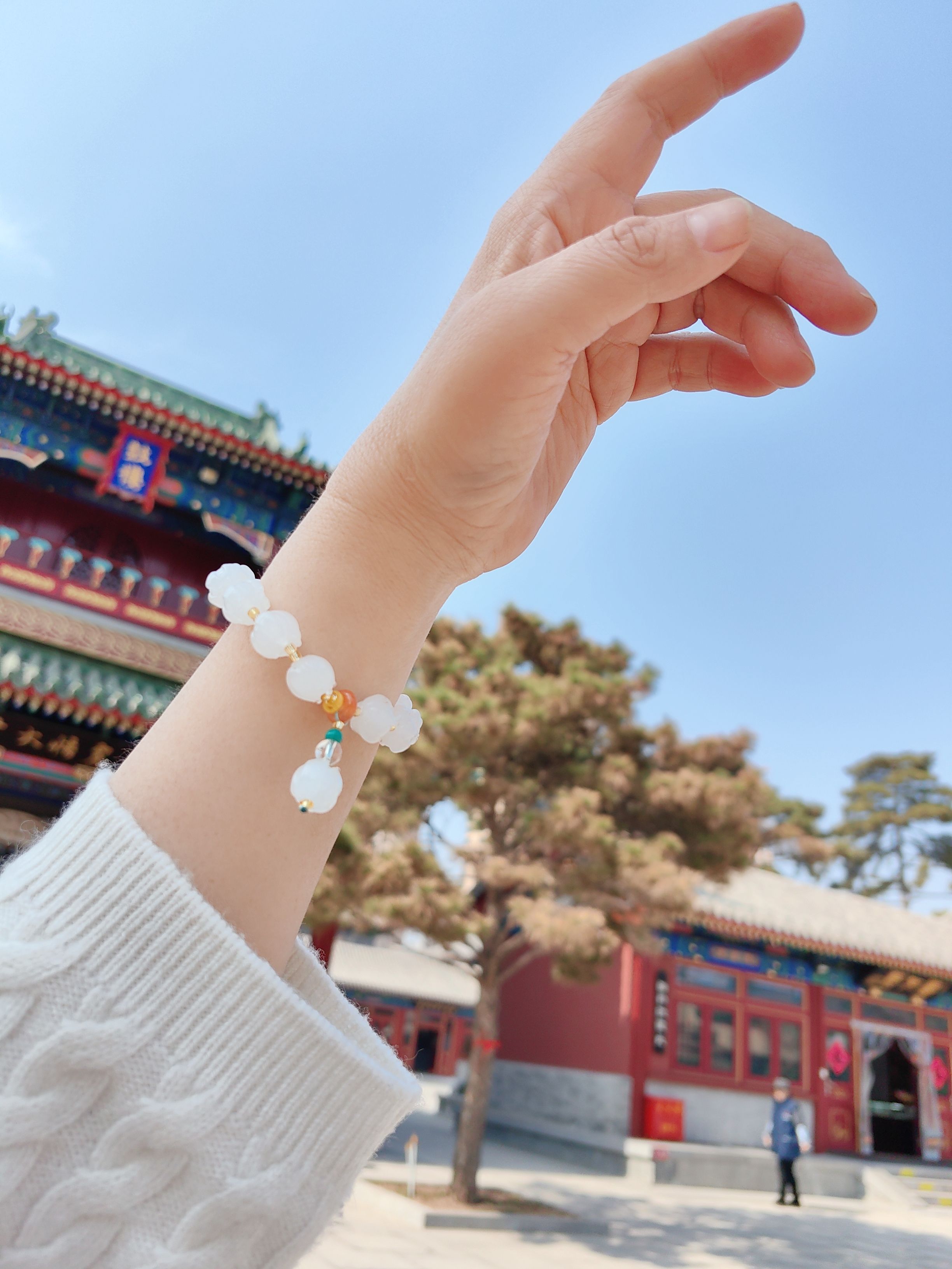 去把爸爸请来的菩萨请回去了,办完事去法物流通处溜达,买了一条生肖手串,一回头,看到了白白的琉璃串,就一眼相中拿下了,出来后发现,和妈妈很配,说不定就是要买给她的