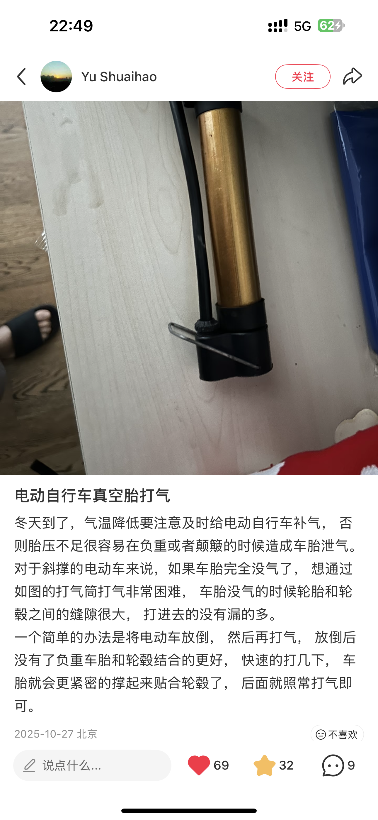 今天电动车放在外边半天,后轮泄气了,回来想着用打气筒打气试试,家里只有一个篮球打气筒(图中同款),对着后轮打了半天没反应,我还以为轮胎破了,想着明天去换个轮胎。回家随手小红书搜了下,发现有人分享,按照帖子的分享的方法打气果然成功了,只能说小红书还是太全面了!!!