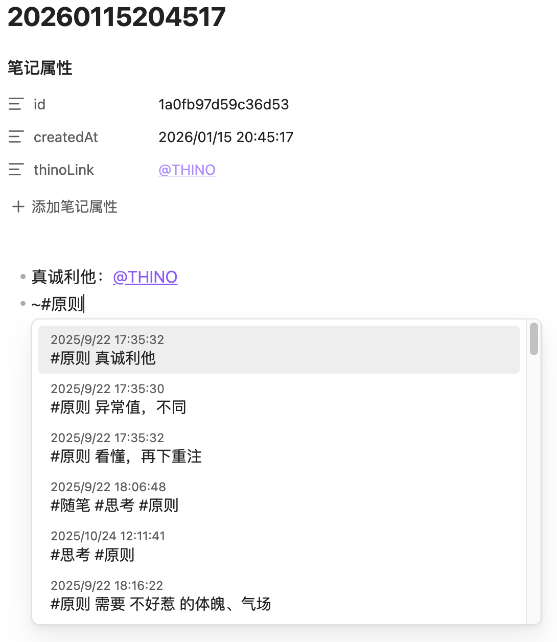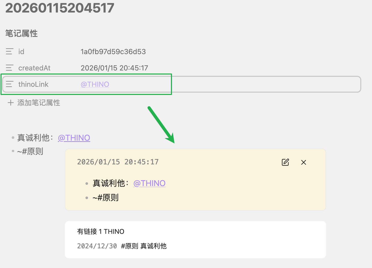 2、打开Thino条目的文件时,会自动生成一个属性thinoLink,点击它的值可以调出Thino的阅读视图,方便查看条目的引用和被引关系