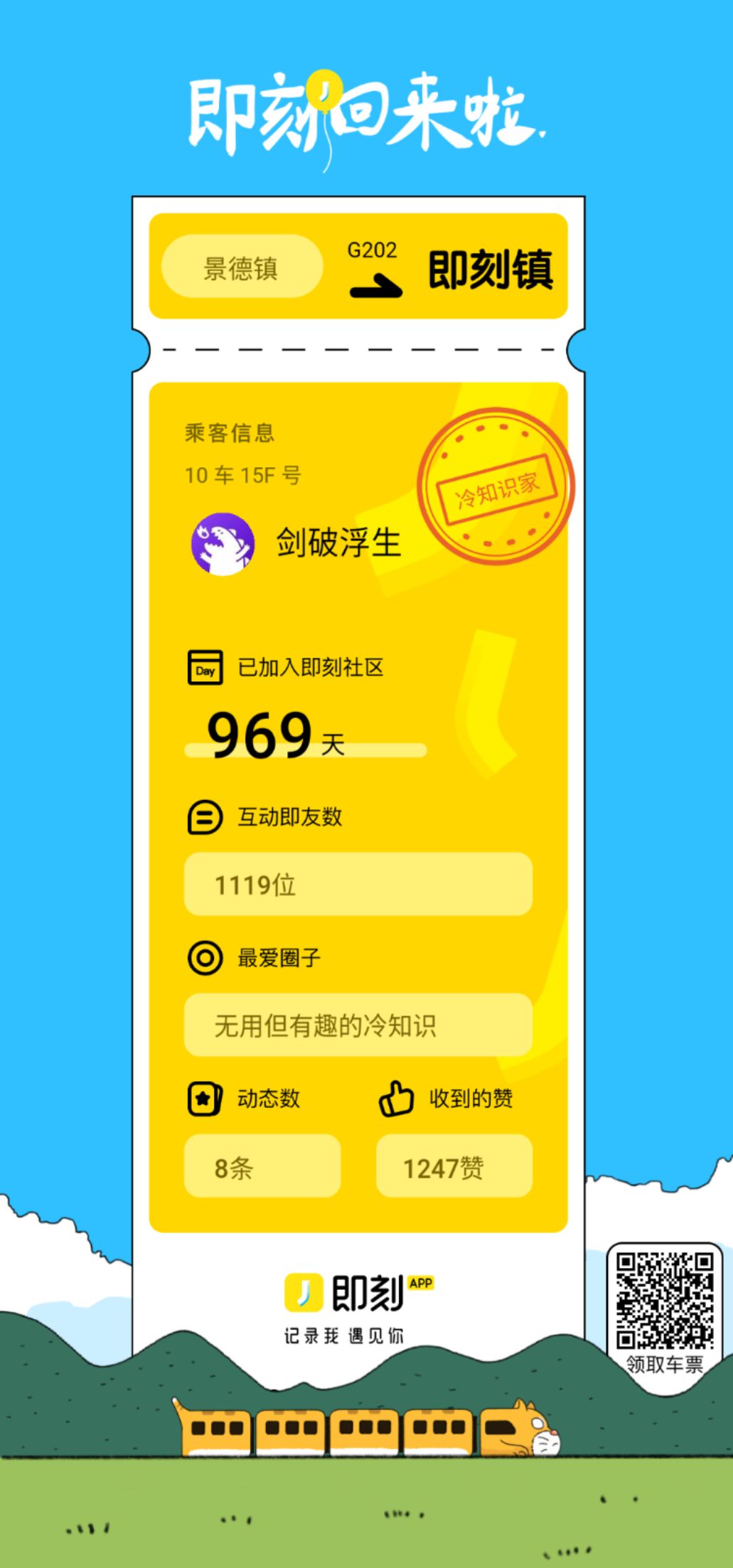 即刻编辑: 即刻App回来啦!回归号列车将开往即刻镇,车票上写满了你的即刻记忆。快来领取车票上车吧 👉https://h5.okjike.com/jike-is-back?displayHeader=false&displayFooter=false 不过,还有不少即友不知道回归喜讯,把你的车票发往各处,比如朋友圈、微信群、微博,帮更多即友回来吧! 往后的日子里,继续记录我,遇见你。