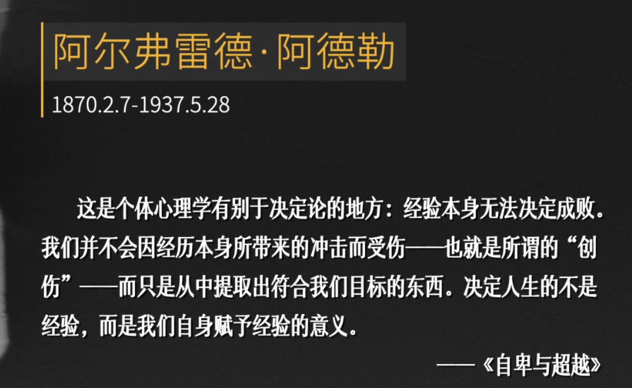 这就是“经验本身无法决定成败我们并不会因经历本身所带来的冲击而受伤--也就是所谓的“创伤”--而只是从中提取出符合我们目标的东西。决定人生的不是经验,而是我们自身赋予经验的意义,”