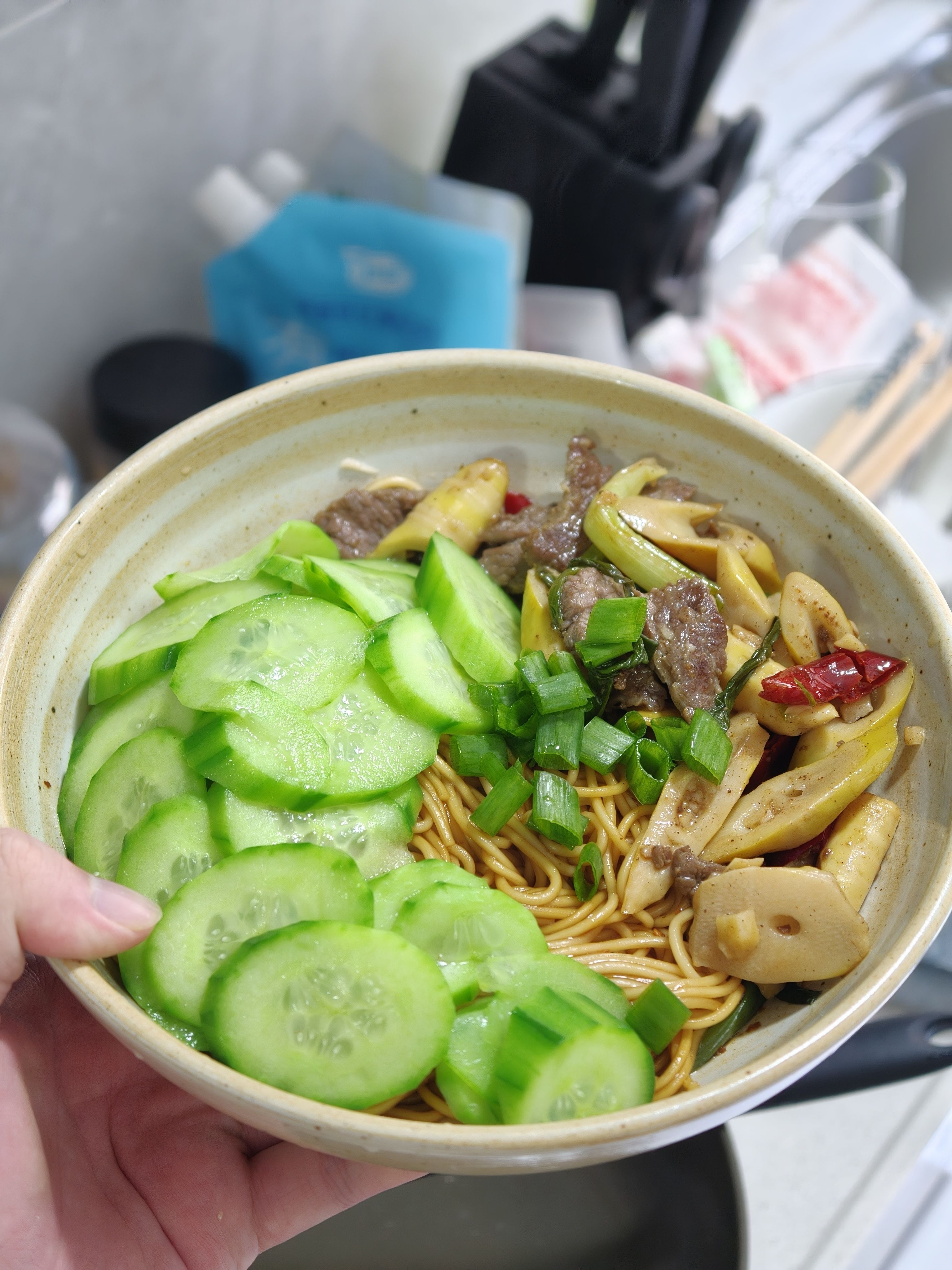 做了黄瓜酸笋牛肉面,吃完出门玩ʕっ˘ڡ˘ςʔ🍜