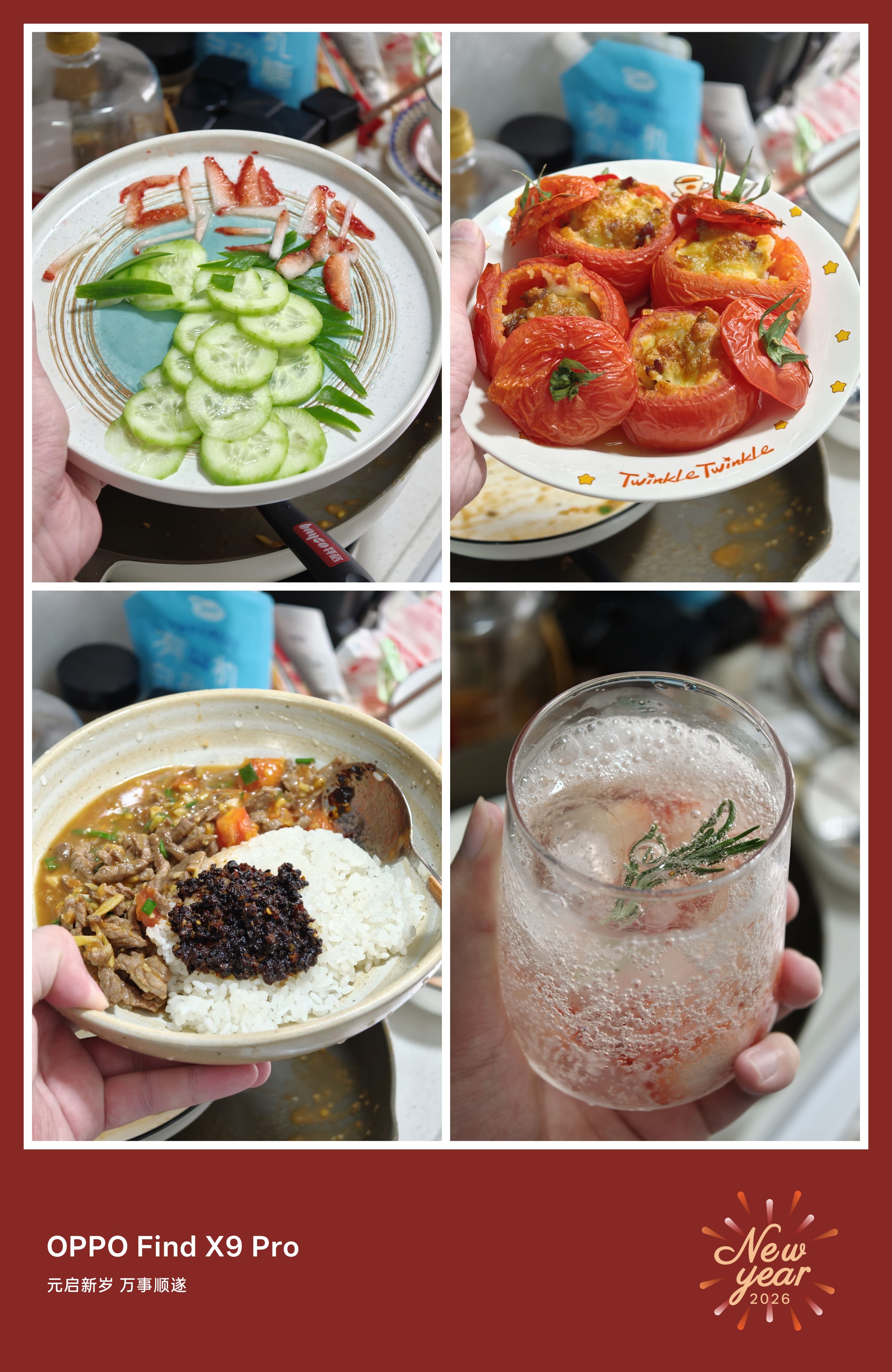 一马当先+柿柿如意+番茄牛肉盖饭+草莓气泡酒。