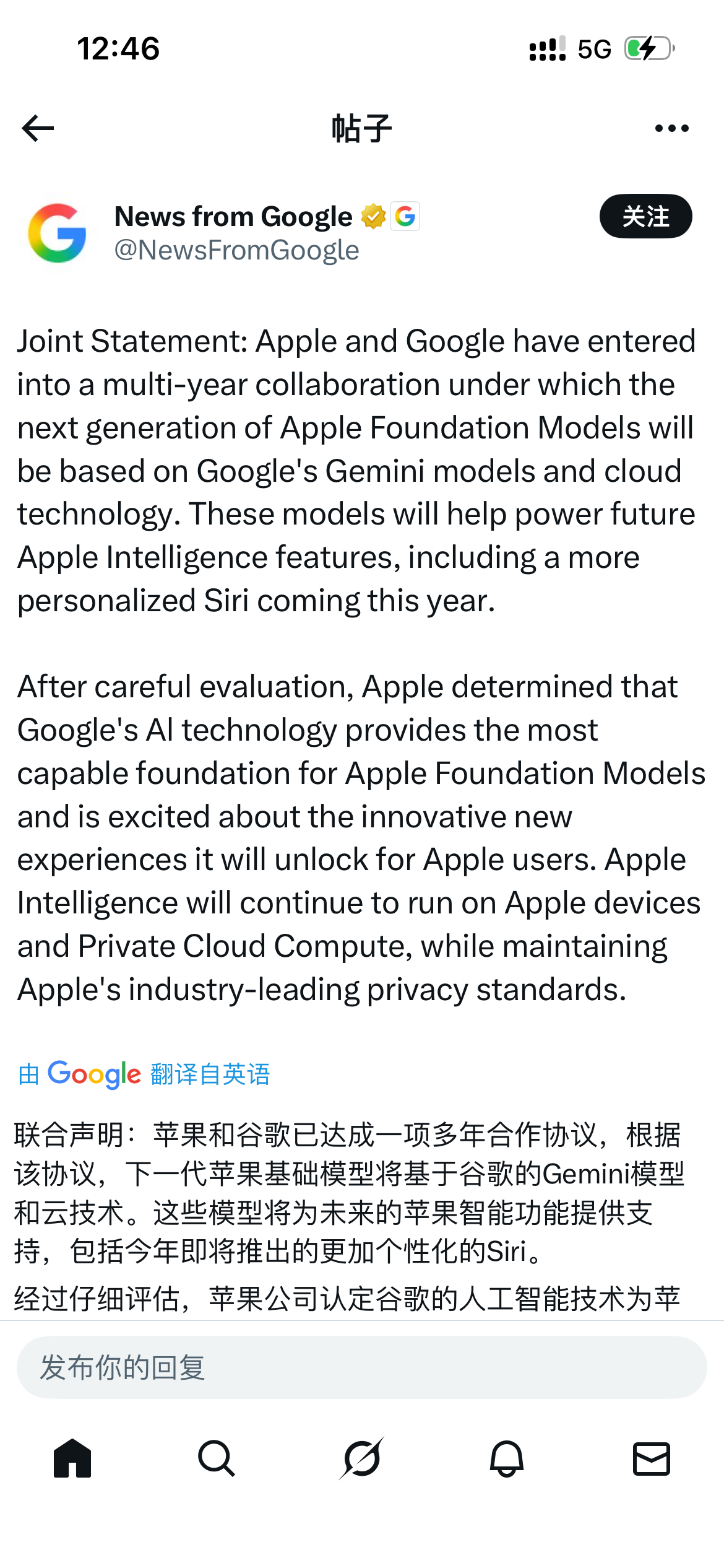 来自谷歌的官宣,Apple Intelligence将以Gemini 为基础