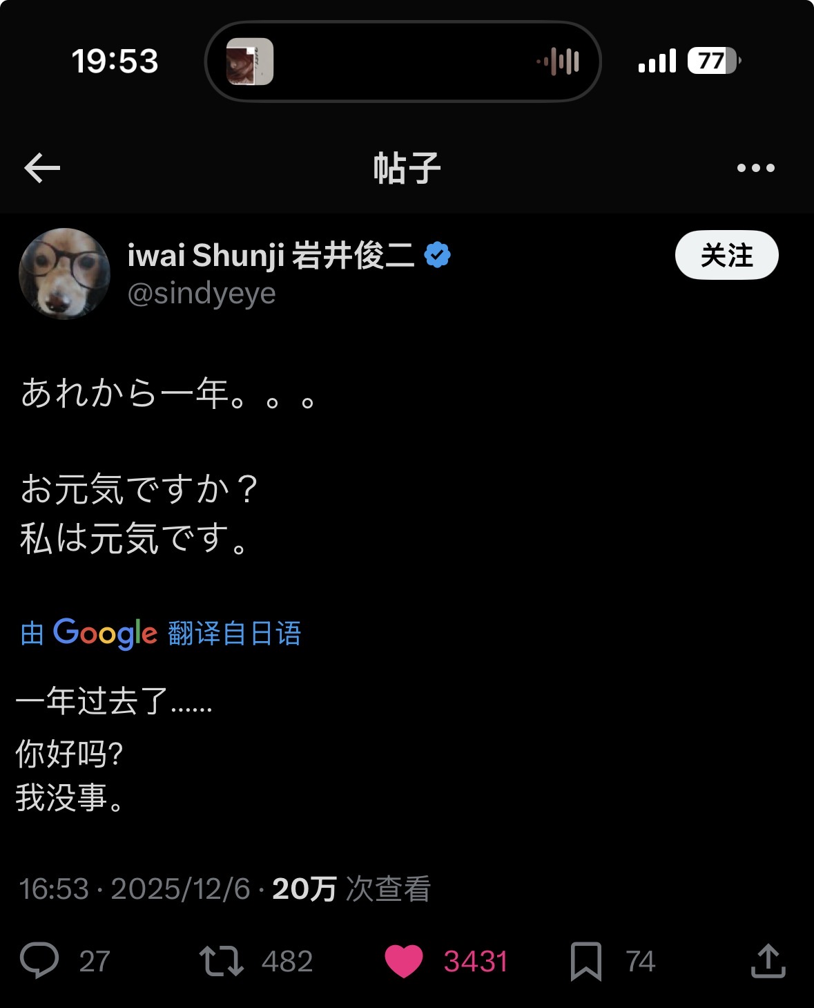 “我第一次见到塔可夫斯基,是在我第一次访问苏联,去莫斯电影制片厂(Mosfilm)参加一场为我举办的欢迎午宴时。他个子不高,身材瘦削,看上去有点孱弱,但同时又格外聪慧,异常机敏、敏感。我觉得他有点像武满彻,但我也说不上为什么。一会儿他对我说了声‘我还得去工作’,就告辞离开了。过了一阵子,我听到一声巨响,大到让餐厅里所有玻璃窗都猛烈震动起来。看到我被吓了一跳,莫斯电影制片厂的厂长意味深长地笑着说:‘放心,又不会爆发新的世界大战。那只是塔可夫斯基发射了一枚火箭。这次和塔可夫斯基的合作,对我来说倒是真的一场“大战争”。’
