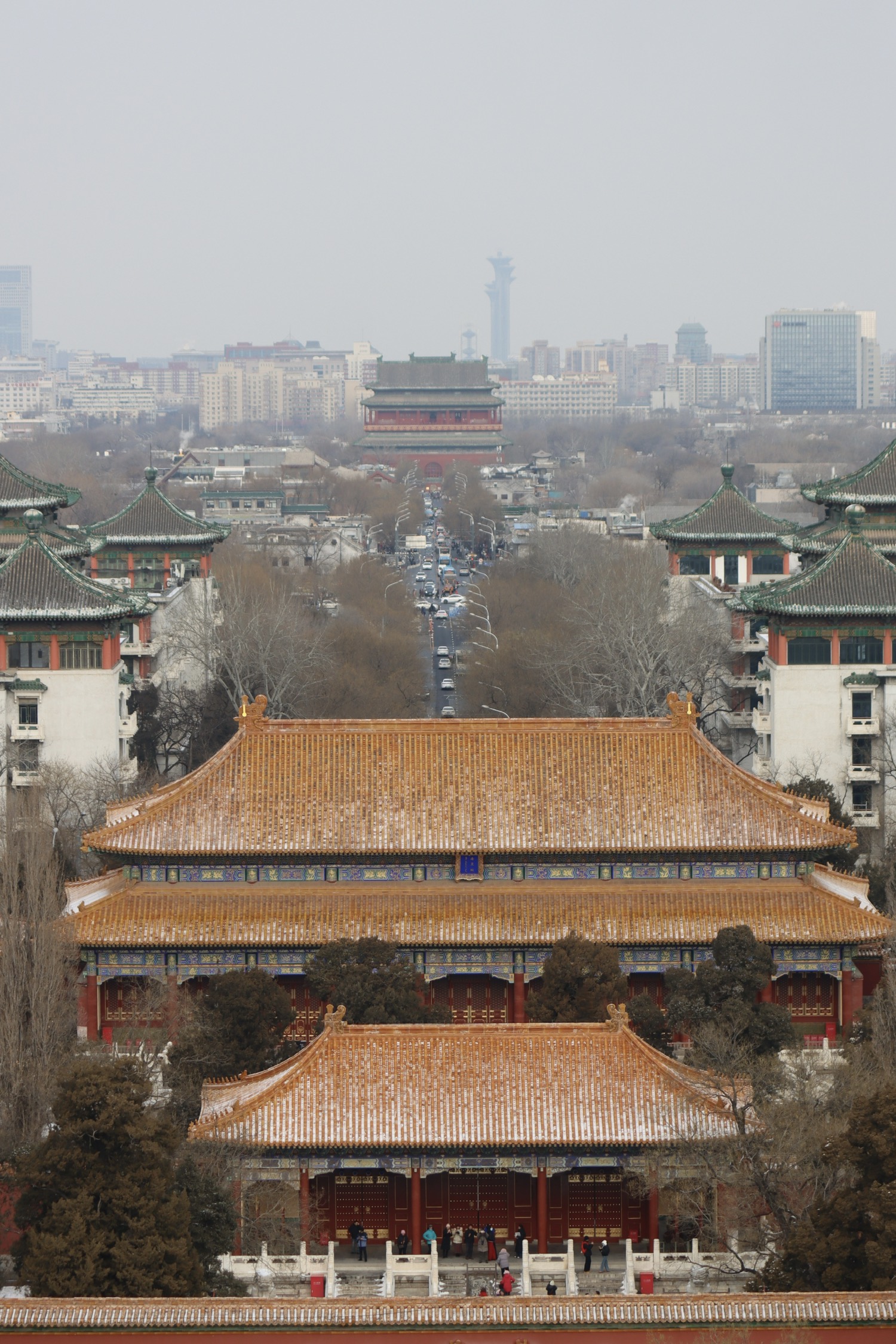 景山上沿着中轴线,往南看故宫、往北看鼓楼、往西看北海公园。