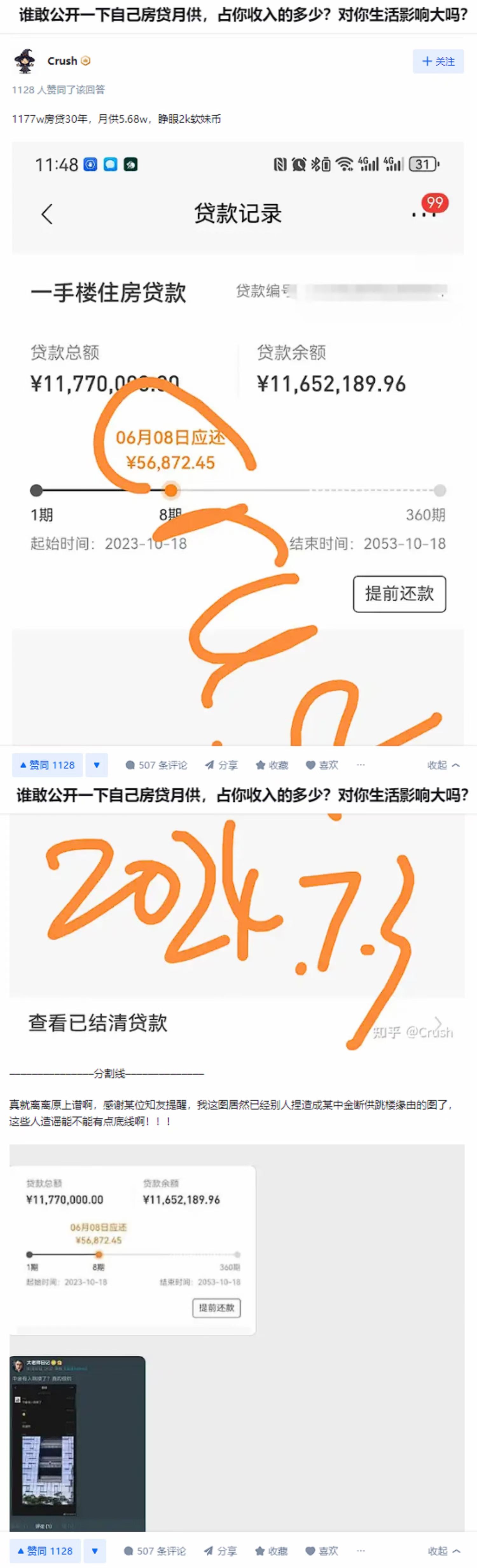 1、但凡提到房贷的信息都是假的,由此引发的思考都是情绪。因为那张图来自知乎某个作者(讨论房贷压力的话题),后来作者被人告知,很生气,回到知乎改了帖子,还把图片加了水印